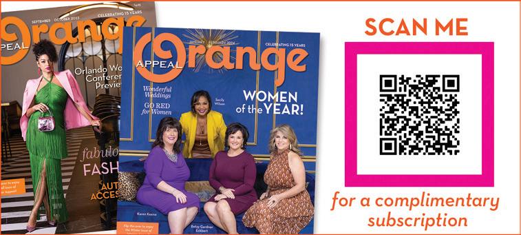 Orange Appeal (Permit #201) is published bi-monthly by Appeal Media & Events Group, 1903 Michael Tiago Circle, Maitland, FL 32751. Printed in USA. Standard postage paid at Harrisburg, PA and additional mailing offices. POSTMASTER: Send address changes to Orange Appeal, 1903 Michael Tiago Circle, Maitland, FL 32751