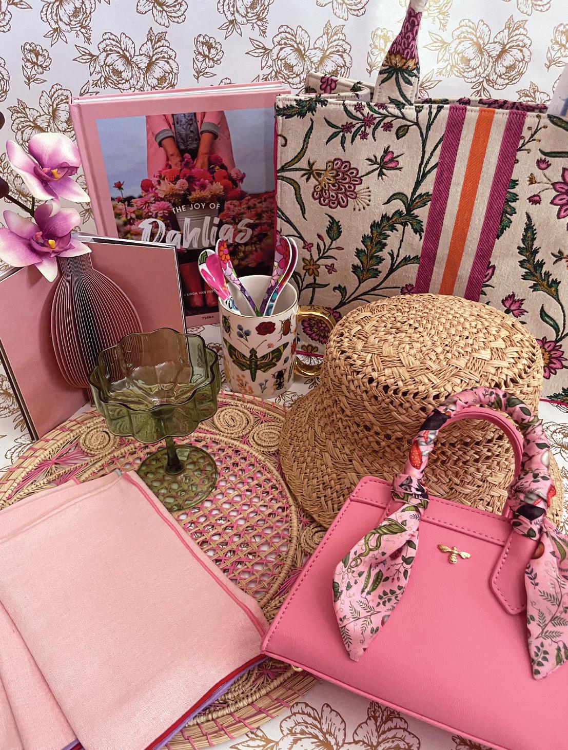 The Joy of Dahlias book, YAY!, Ivanhoe Village; Shiraleah tote, Hunt & Hostess, Winter Park; Flowery Tale book-shaped flower vase, The Atelier Winter Park; Dessert spoons, YAY!; Rifle Paper Co. coffee mug, Pistil Home & Garden; Fazeek green coupe glass, Hunt & Hostess; Lock of Color raffia straw hat, Tuni; Atelier Saucier 4-piece napkin set, Gold Dust Home, Mills 50 District; Iraca hand-woven placemat, Clementine, Winter Park; Catherine Rowe Designs x Fable England mini handbag, Hunt & Hostess.