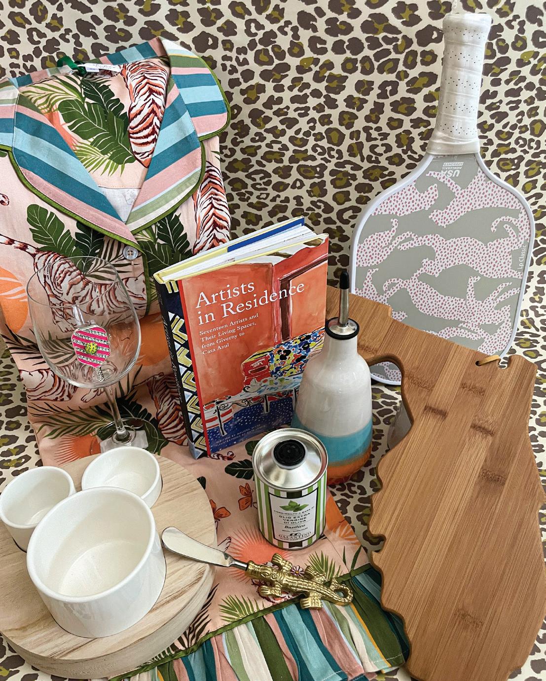 Jayes Studio + Paisley & Dot Athena luxe sateen capri pajama set, Crosby + La Point pickleball paddle, and The Queens’ Jewels pickleball stemmed glass, Monkee’s of Winter Park; Artists in Residence book, Gold Dust Home; Galantino extra virgin olive oil, and oil cruet bottle, Maffrey’s; Santa Barbara Design Studio dip bowls & tray, The House on Lang; Ihi alligator spreader and Totally Bamboo Florida cutting & serving board, Simply Cheese.