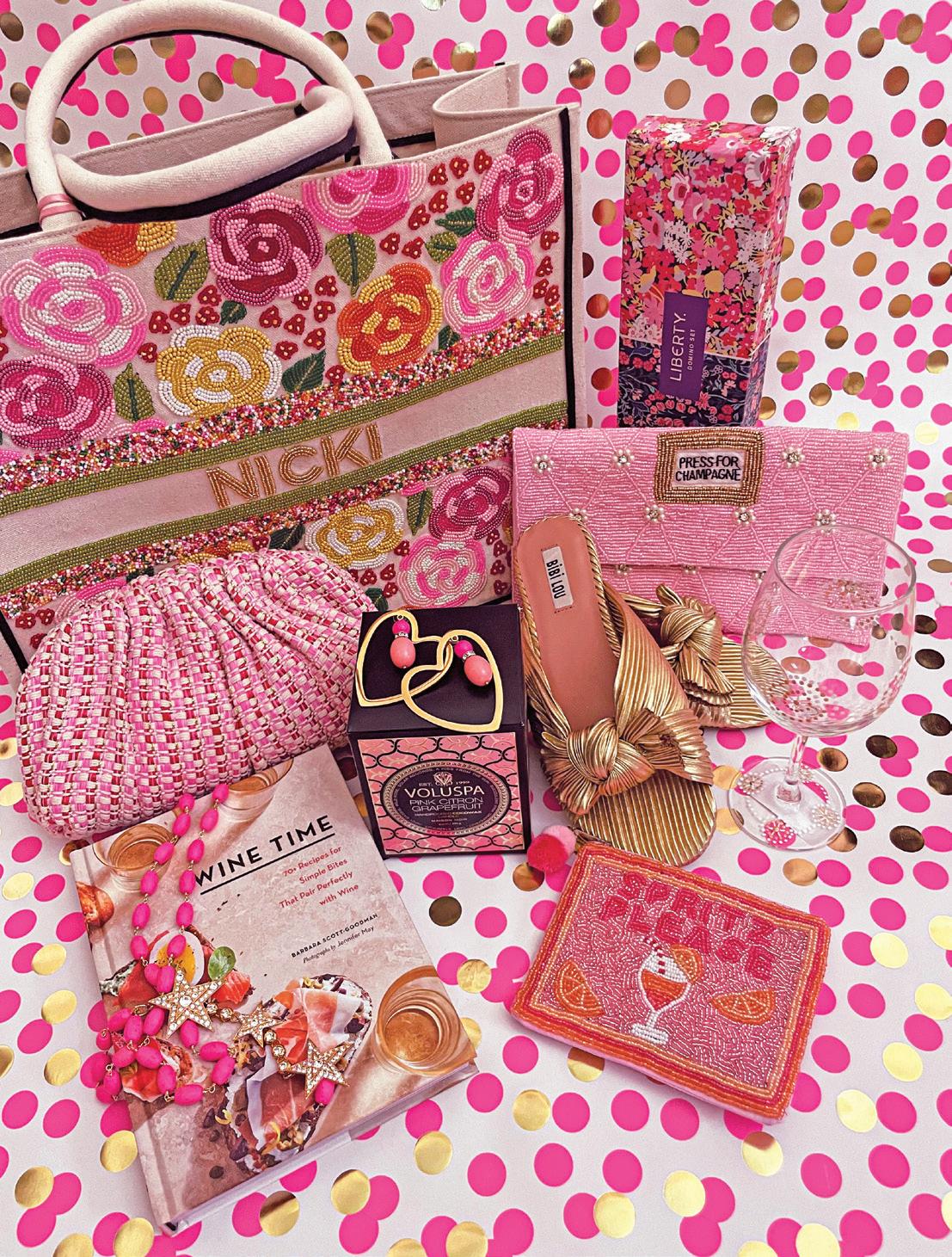Tiana NY personalized floral tote, The Grove, Winter Park; Liberty Domino Set, Gold Dust Home; Press for Champagne beaded clutch, YAY!; Shiraleah Salerno clutch, The Grove; With Her Whole Heart earrings, Dora Mae Jewelry; Voluspa Pink Citron Grapefruit candle, LaBella Intimates; Bibi Lou gold pleated bow flats, Tuni; Robin hand-painted stemmed wine glass, The House on Lang, Mills 50 District; Virtuoso of Sparkle pink enamel beaded necklace, Dora Mae Jewelry; Wine Time book, Pistil Home & Garden; Spritz Please beaded coin clutch, YAY!