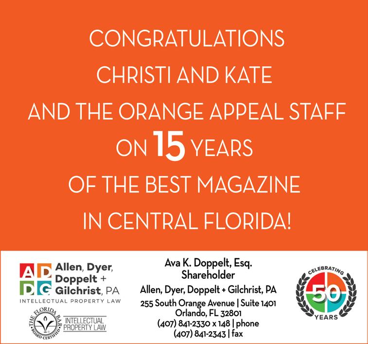 Orange Appeal (Permit #201) is published bi-monthly by Appeal Media & Events Group, 1903 Michael Tiago Circle, Maitland, FL 32751. Printed in USA. Standard postage paid at Harrisburg, PA and additional mailing offices. POSTMASTER: Send address changes to Orange Appeal, 1903 Michael Tiago Circle, Maitland, FL 32751