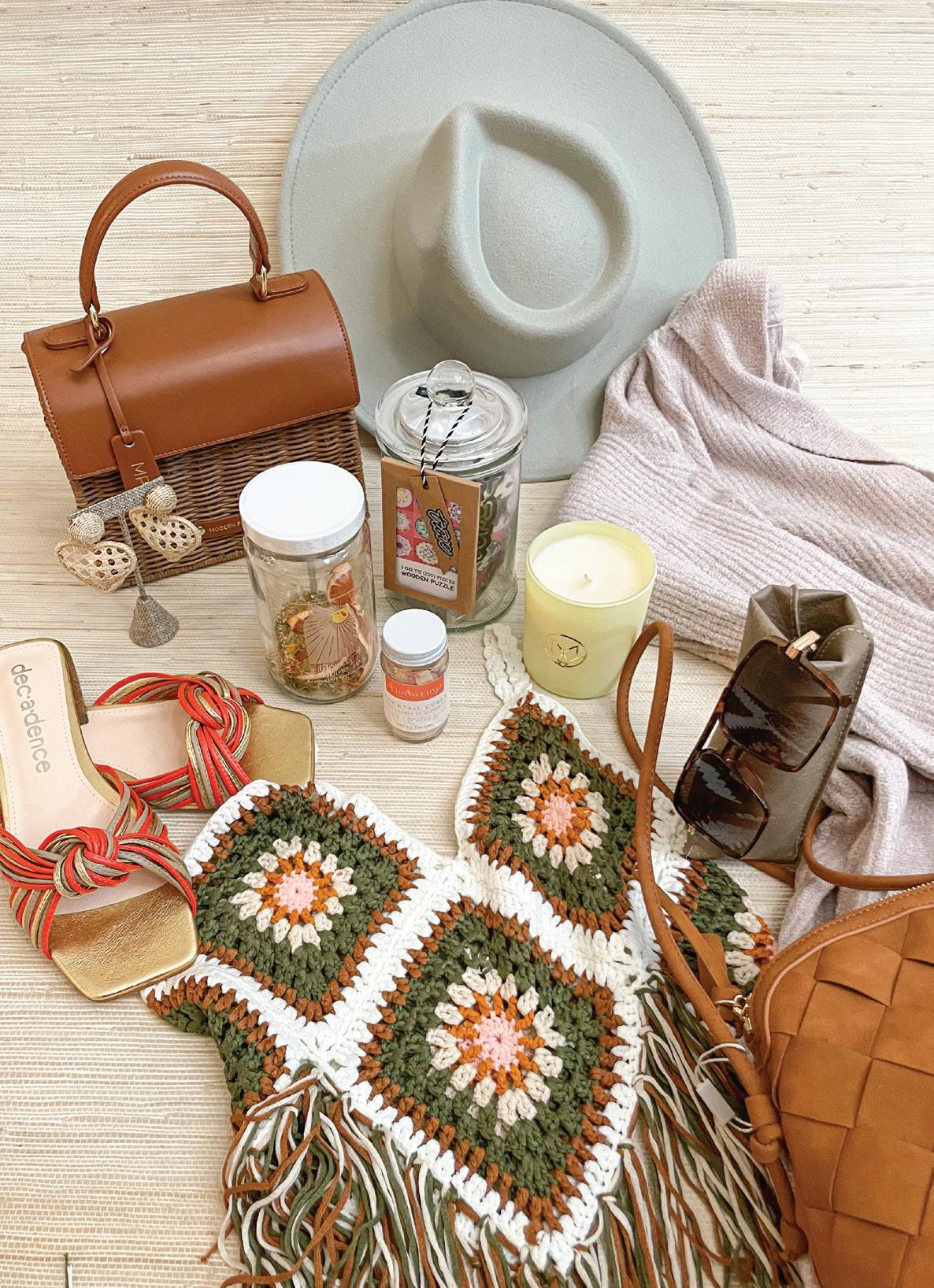 Austin mint hat, $42, The House on Lang; Modern Picnic Not Your Average Lunchbox, $139, and woven heart earrings, $98, The Hunt; Trove wooden puzzle, $42, Curious Botanicals Florida Sunshine Tea infusion kit, $25, Flouwer Co. Orange Blossom cocktail cubes, $19, and Musee Jasmine Petals & Quince candle, $24, all from Maffrey’s; Barefoot Dreams faded Rose Pearl bathrobe, $118, Pistil Home & Garden; Decadence Adeline slides, $188, Monkee’s of Winter Park; Looking Good standing eyeglass holder, $24, The Grove; Cabo crocheted fringe top, $48, sunglasses, $18, and Moda Luxe Calista bag, $70, all from The House on Lang.