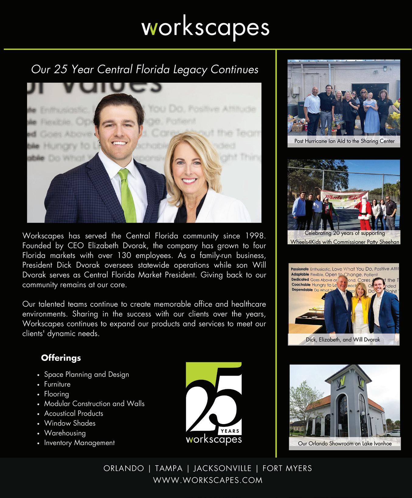 Workscapes is a certified woman-owned business that started in 1998. As a turnkey commercial interior solutions partner, Workscapes offers services including space planning and design with products including furniture, modular walls, acoustical products, and flooring. The company now has four Florida locations: Tampa, Orlando, Jacksonville and Ft. Myers. As a certified MillerKnoll dealer and DIRTT partner, Workscapes and interior construction division Buildscapes, also represent more than 300 manufacturers of high-quality office furniture and modular solutions. Founder Elizabeth Dvorak has appeared on two Orange Appeal covers. workscapes.com