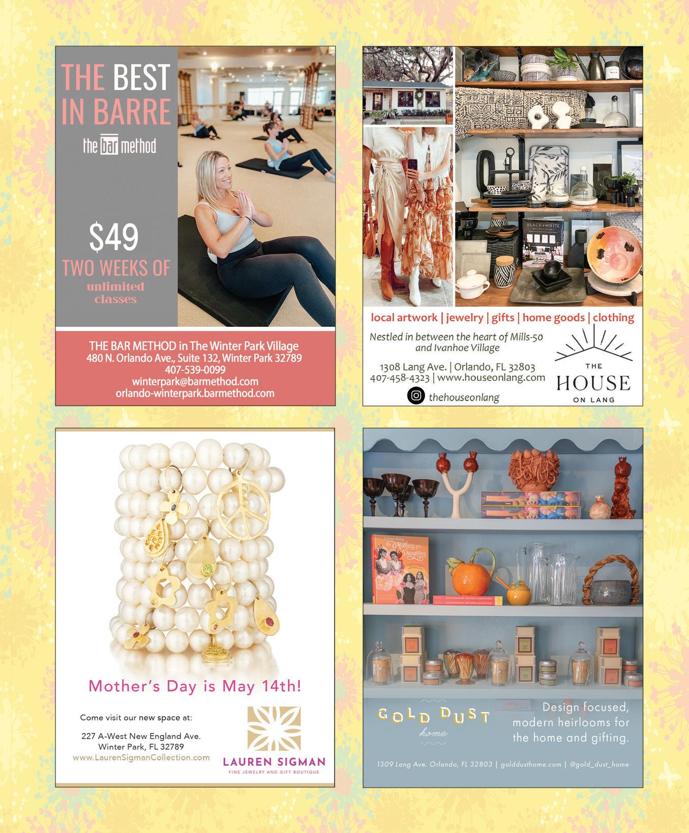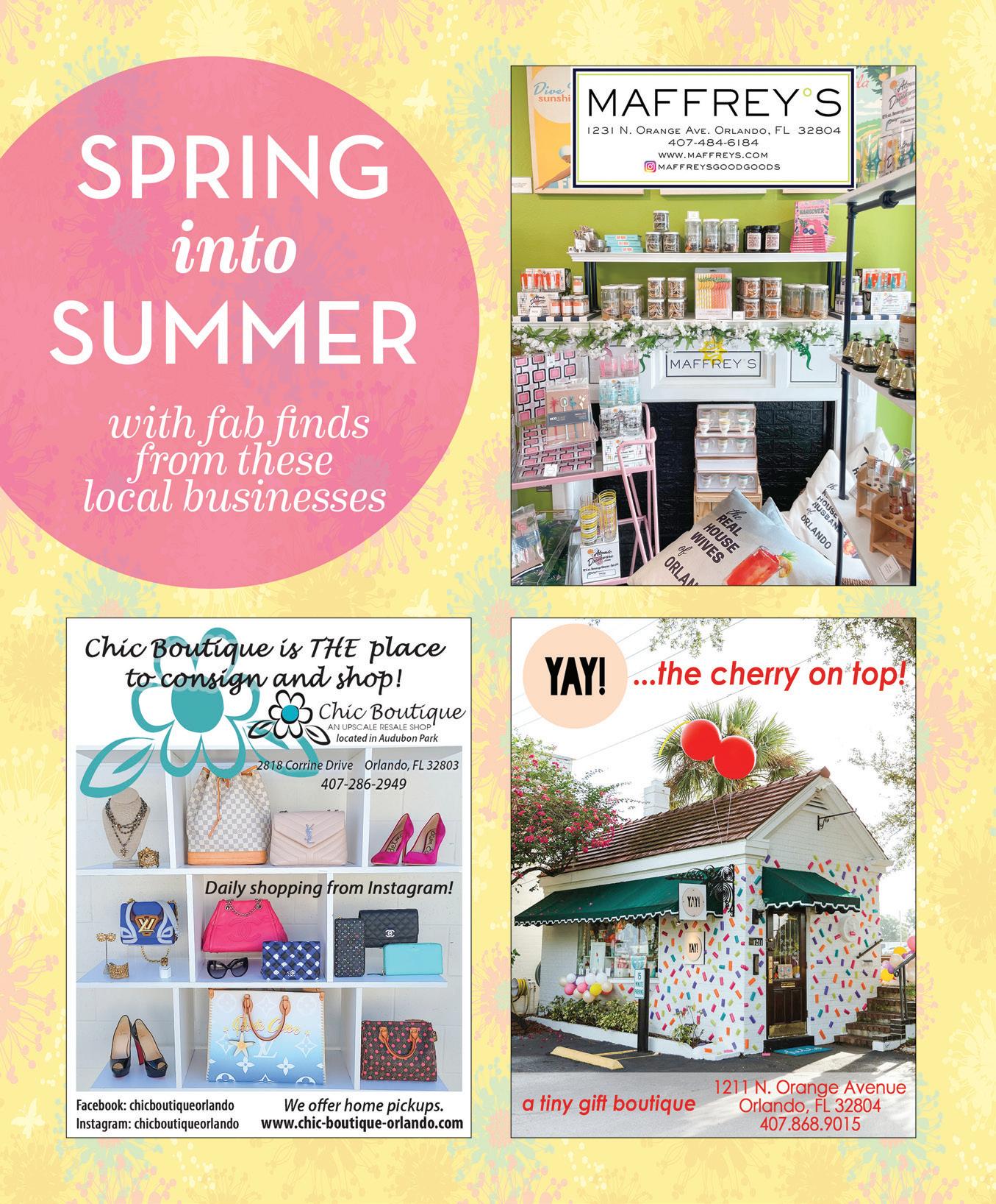 This spring selection includes fabulous items from local boutiques that are perfect to give to someone special or to keep for yourself. Peruse the variety, from fashion forward to wildly whimsical and everything in between, from LaBella Intimates & Boutique, Maitland; Clementine, The Grove, The Hunt, Frank , Monkee's, COCO Indigo, and Tuni, Winter Park; Gold Dust Home and The House on Lang, Mill 50 District; Maffrey’s and YAY!, Ivanhoe Row; and Pistil Home & Garden, Windermere.