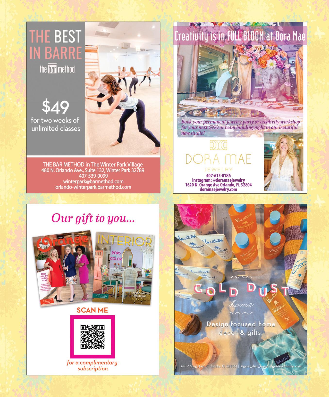 People, places and things: Great for travel and backyard barbecues, these fun fashions will make a statement at any midsummer soiree; Eye on Arts: Gail & Mike Winn’s commitment to the Orlando Museum of Art’s Florida Prize exhibit; A performing arts preview; Women to Watch: Sherry Magee and the Spa Invitational committee celebrate 10 events that have impacted Grace Medical Home; Talli Dippold’s mission to erase hate through education and understanding.