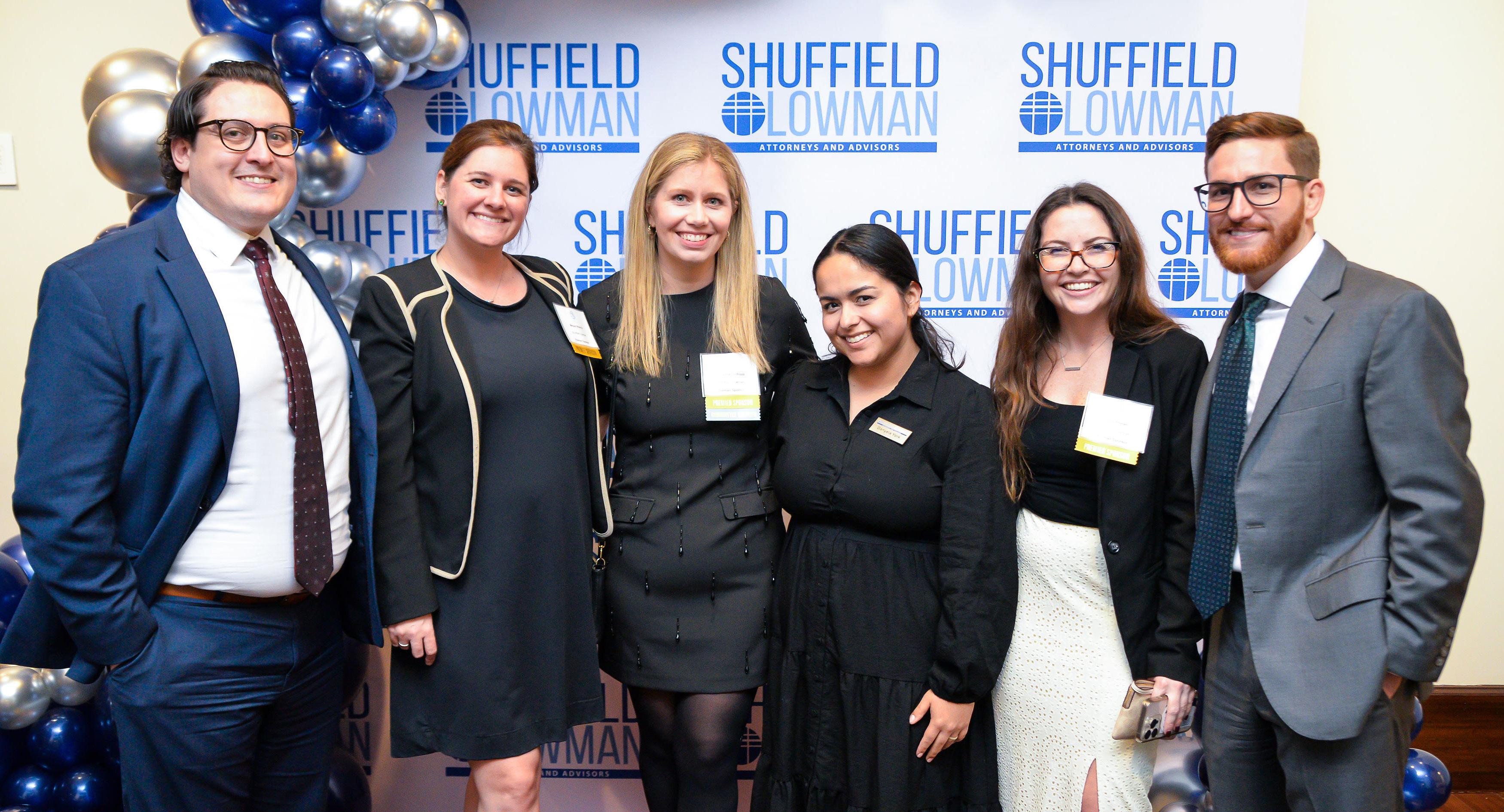 1 Adam Wicker (left), Megan Nowicki, CeCe Phelan, Julianna Tschopp and Danyela York and YLS President Cooper Powell at the Legacy and Lights Holiday Party.