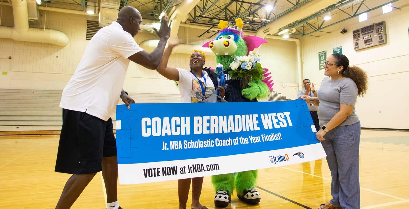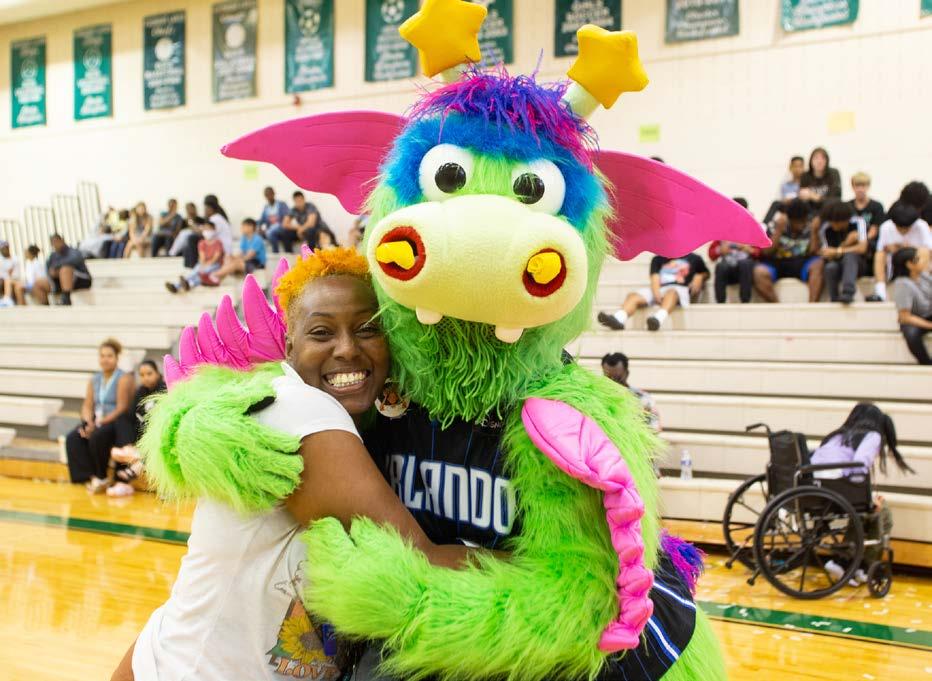 Big hugs from Stuff, the Orlando Magic mascot, as Coach Bernadine West of Piedmont Lakes MS finds out she is a finalist for Jr. NBA Scholastic Coach of the Year. Former NBA player Bo Outlaw visited the school to honor Coach West.
