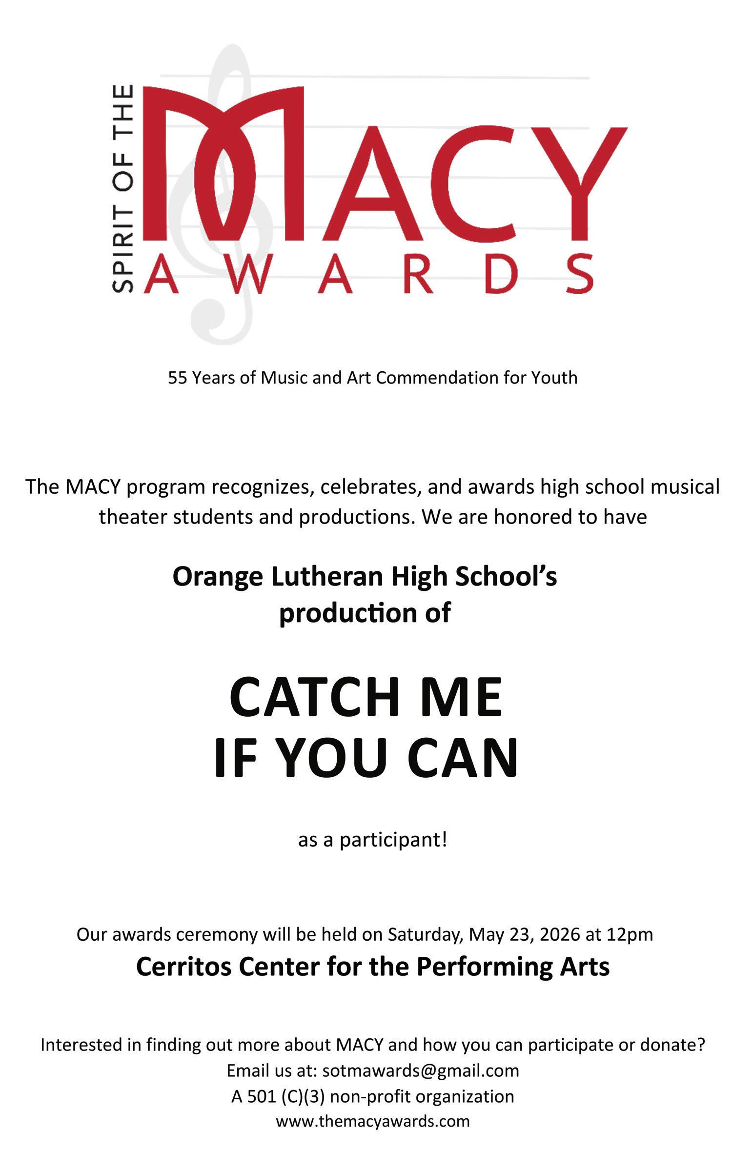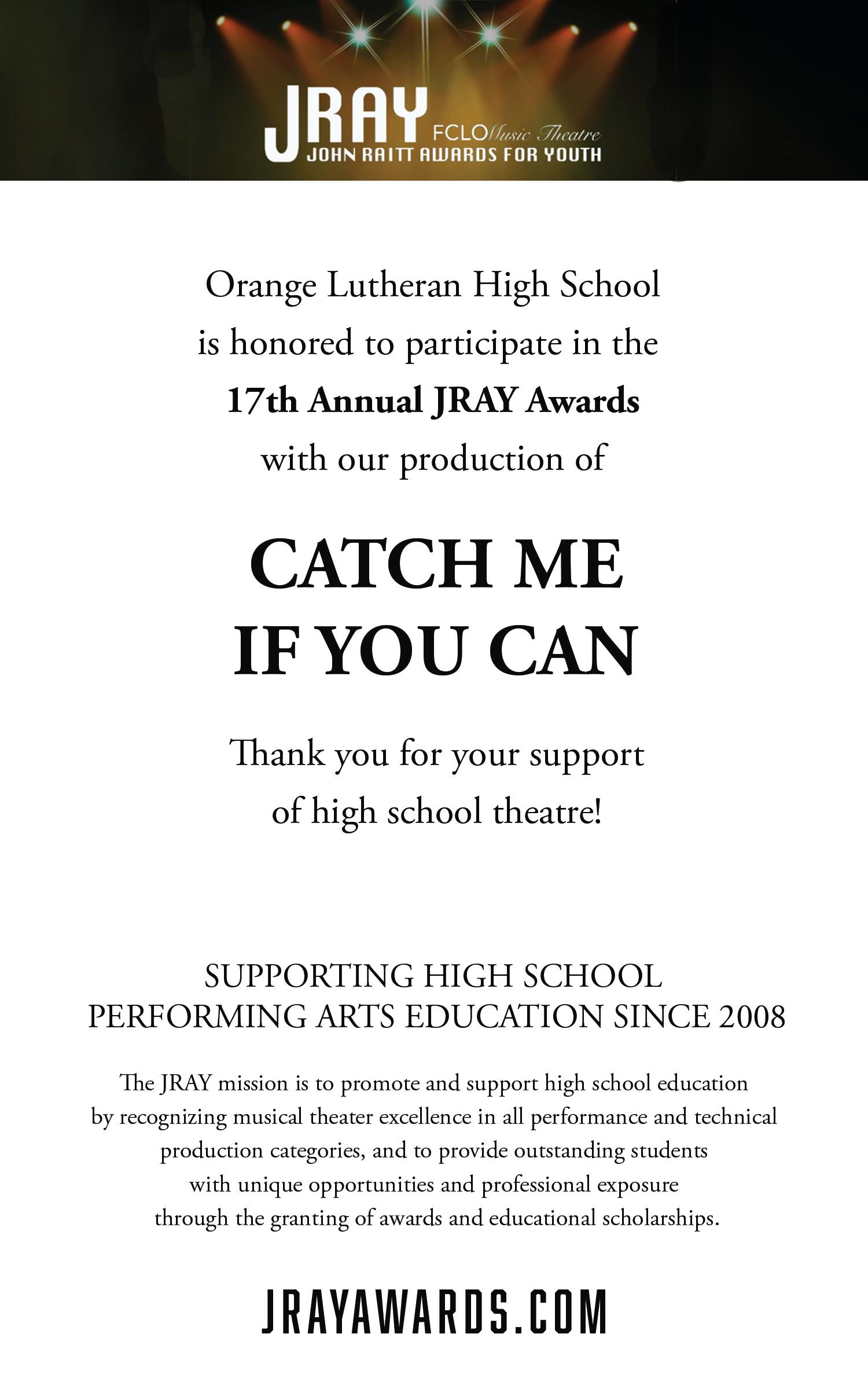 Carole Zelinger has been the Costume and Wardrobe Supervisor at Orange Lutheran for the past 11 years. CatchMeIfYouCanwill be the 34th dramatic arts production she has designed at OLu, along with 35+ Premiere, Gala, dance and choral productions. Carole feels blessed to work with an incredible production staff and talented students in a Christian environment that nurtures arts education, teamwork, creativity and individuality. Orange Lutheran is truly her “Happy Place.” Thank you for attending and supporting high school theatre. Hope you enjoy the show!