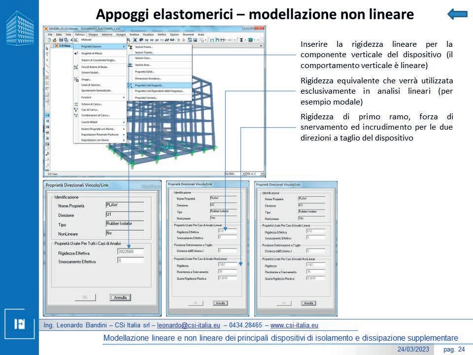 • la terza parte è un approfondimento sull’isolamento sismico e la dissipazione supplementare di energia, valutandone i principi base e la modellazione numerica. Viene quindi presentata la modellazione lineare e non lineare delle principali tipologie di dispositivi su programmi di calcolo agli elementi finiti;