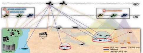 • processamento di bordo. In generale la costellazione ibrida si basa sui concetti di multi-costellazione e multi-missione e l’analisi di possibili scenari operativi di interesse militare ha mostrato la necessità di soluzioni sistemistiche multi-missione e dinamicamente riconfigurabili nel tempo. Componenti necessari devono essere payload con capacità di comunicazione di tipo M2M, data relay e monitoraggio di sorgenti EM. Necessaria la capacità di interazione con future costellazioni/satelliti per fornire servizi con migliori prestazioni. Si dovranno attuare strategie di dispiegamento incrementale della costellazione di due tipologie: