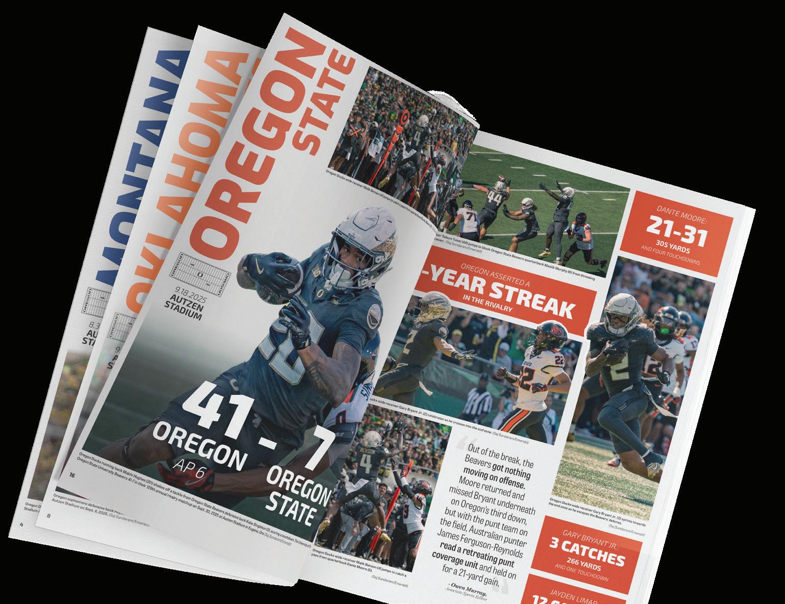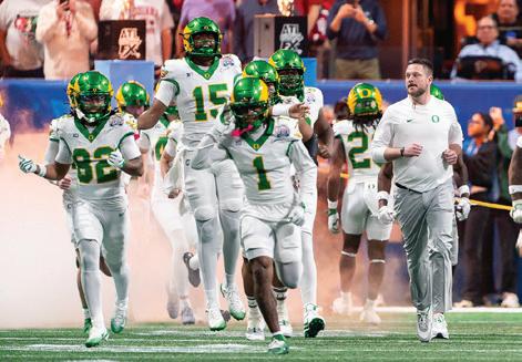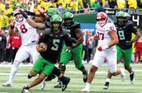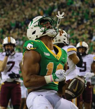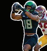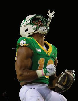 The Ducks officially returned their entire starting defensive line, which included Alexander, Washington and the edge duo of Tuioti and Uiagalelei. Despite los ing multiple depth pieces to the transfer portal, Ore gon will have an experienced group expected to start in the defensive trenches, and its edges are a major part. Tuioti’s 2025 season included a tackle for loss in 14 of 15 games to go with a team-leading 9.5 sacks and two forced fumbles, while Uiagalelei, who led the team in sacks in 2024, stacked it with a six-sack, two-forcedfumble season that peaked with his strip sack of Tex as Tech University quarterback Behren Morton in the Ducks’ 23-0 Orange Bowl win over the Red Raiders.