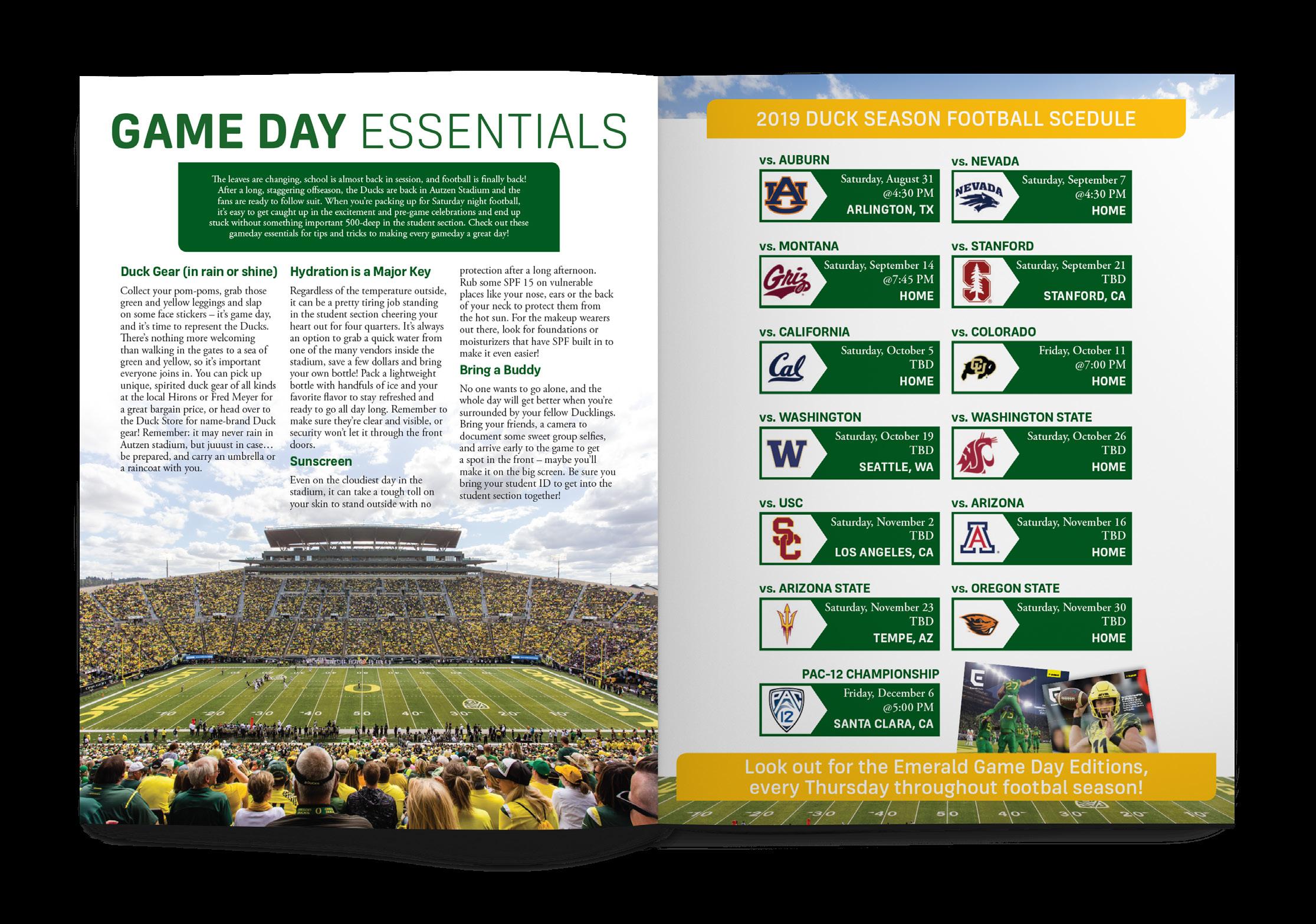 2023 10/2 Ethos 10/5 Game Day (Bye) 10/12 Duck Fest 10/12 Game Day (Washington) 10/19 Game Day (Washington State) 10/23 Duck Living 10/26 Game Day (Utah) 10/30 Green Eugene