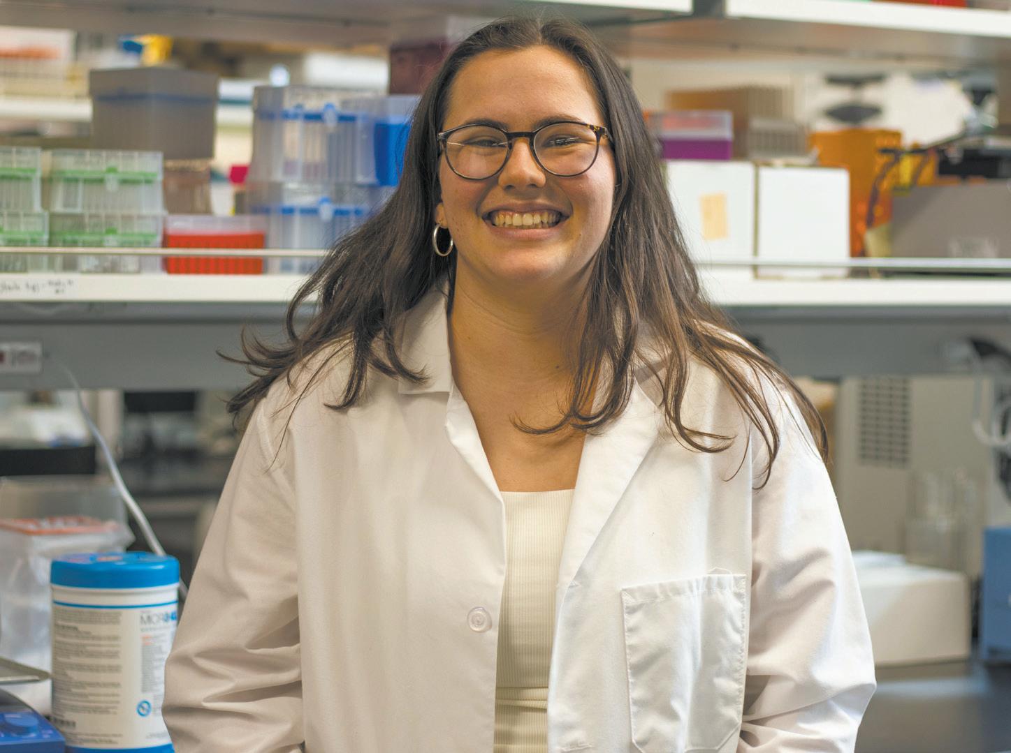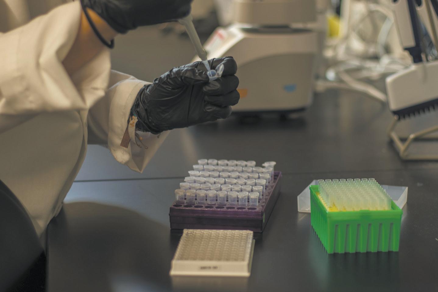 ( ABOVE) Bella Albiani demonstrates how the group pipettes samples from their on-site health test. Once in the lab, the samples go on a well plate and run an Enzyme Linked Immunosorbent Assay that measures cortisol levels from the hair collected from participants.