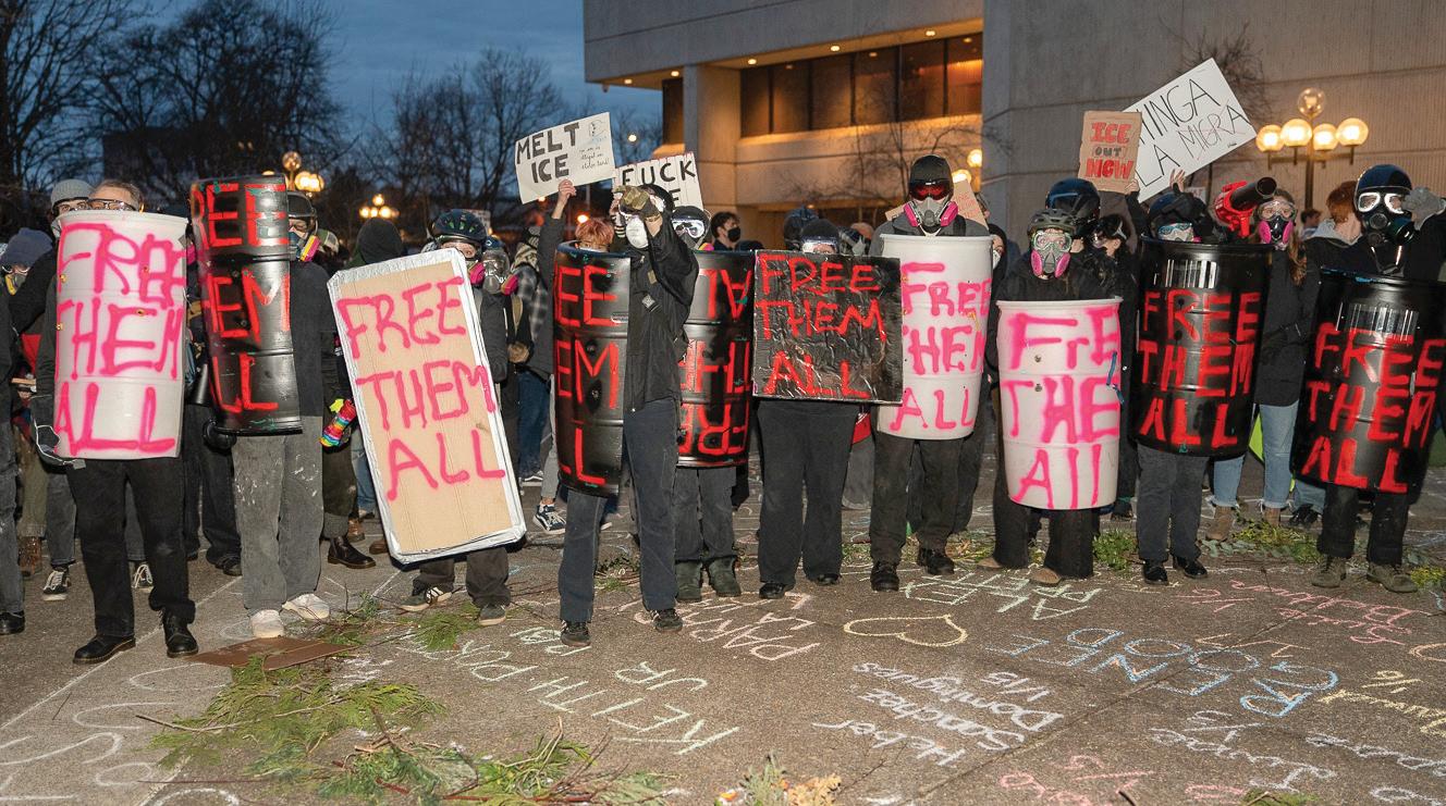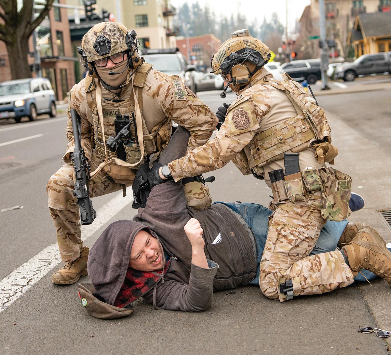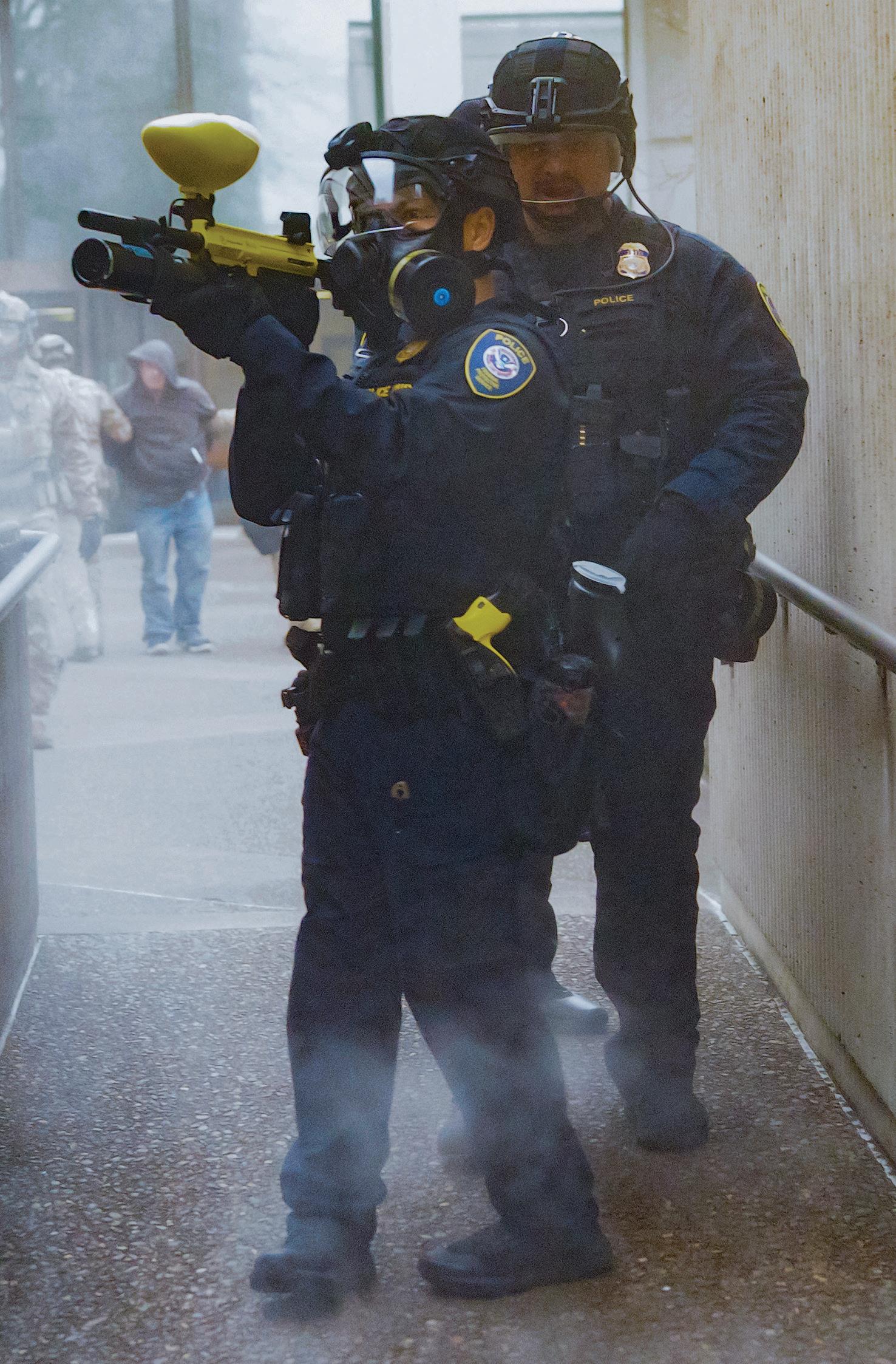 ( ABOVE) Two Customs and Border Patrol Special Response Team members fire crowd control munitions at protesters on the edge of the sidewalk from the courtyard of the federal building. Around 8 p.m., Department of Homeland Security and Customs and Border Patrol Special Response Team agents rushed out of the building, deploying large amount of tear gas, pepper spray and other crowd control munitions into a crowd of roughly 30 protesters at the Eugene Federal Building in Eugene, Ore. on Jan. 31, 2026.