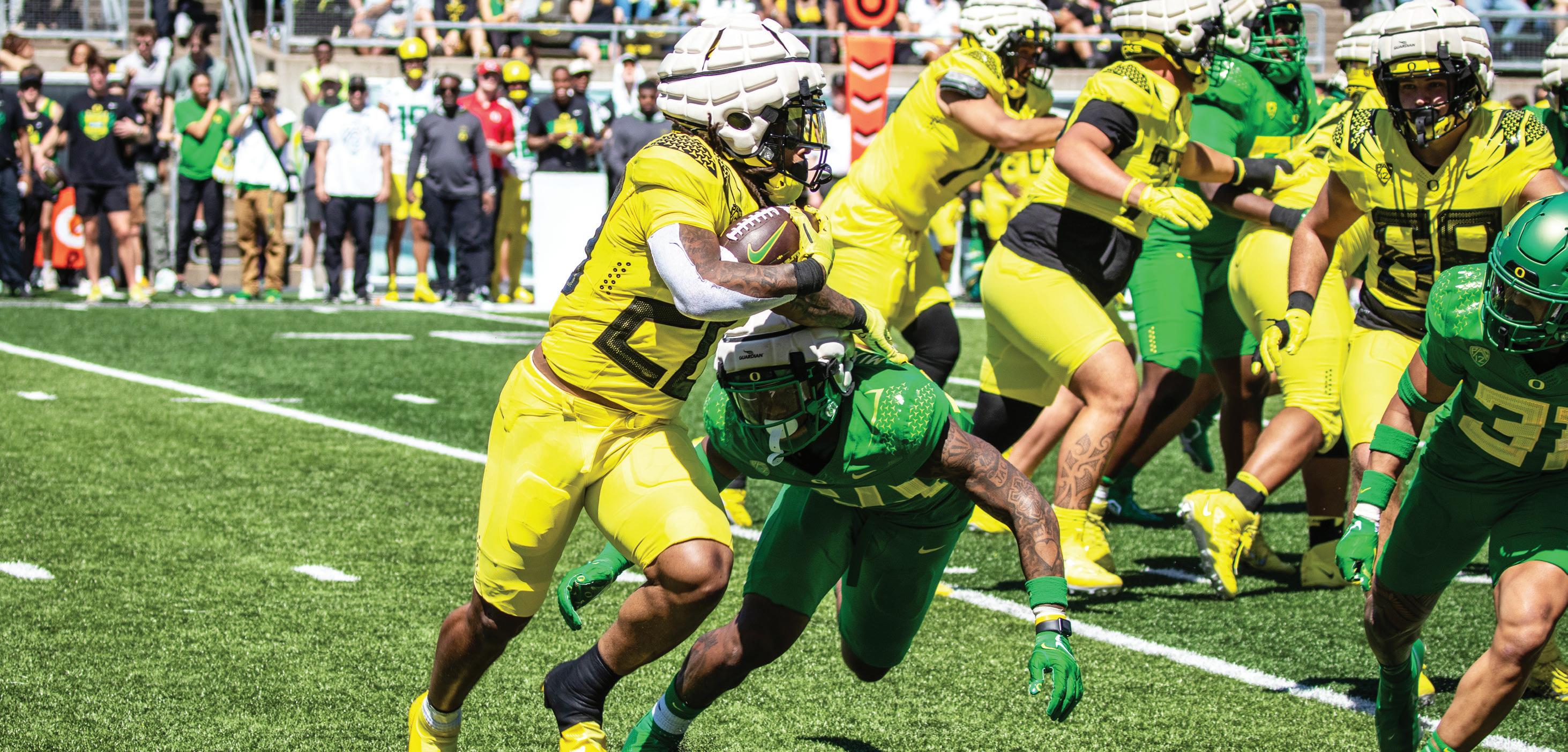 Long time Oregon Duck, Bryce Boettcher (46), tackles Alabama transfer, Treason Holden (5). (Jonathan Suni/Emerald)