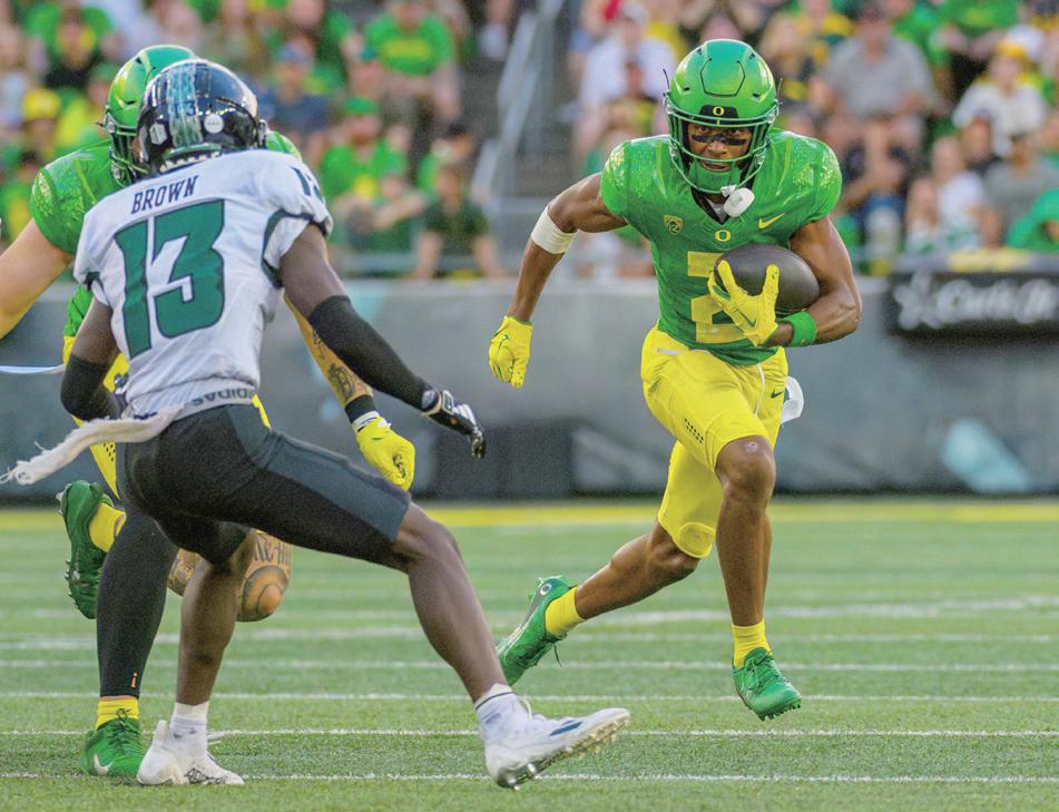 Tez Johnson had his best game to date as a new member for the Ducks. In his third game, the wide receiver transfer from Troy snared 77 passing yards and two touchdowns as well as 48 yards returning punts.