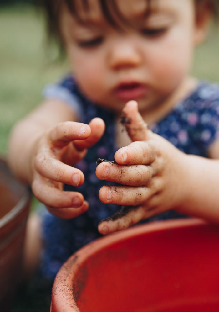 Kids love to physically manipulate the stuff of nature. For some sensory fun, fill a shallow plastic tub with water, soil, or sand (or a combo) and let your young child experiment. To keep everyone happy, make sure your container is in a place where a little messy overflow is okay. No fancy toys are needed –simply provide some plastic containers from your recycling, an old spoon for digging, and some cones, shells, or other natural objects for pretend play.