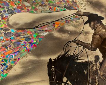 The series called “Golden” began in 2012 and has since become the thread that pulls the siblings back together across distance and time. They work in flurries when timing is right. The first piece, “Lucky Penny,” came to fruition when K.C. was particularly struck by one of Brown’s images of a horse and rider printed on metallic gold paper. She tentatively asked if she could paint on top of it and the end result made it evident that this collaboration would be something special. “Initially I wondered how our uniquely different personalities would match up,” said K.C. “But as it turns out, our differences are what allows each piece to stand out.”
