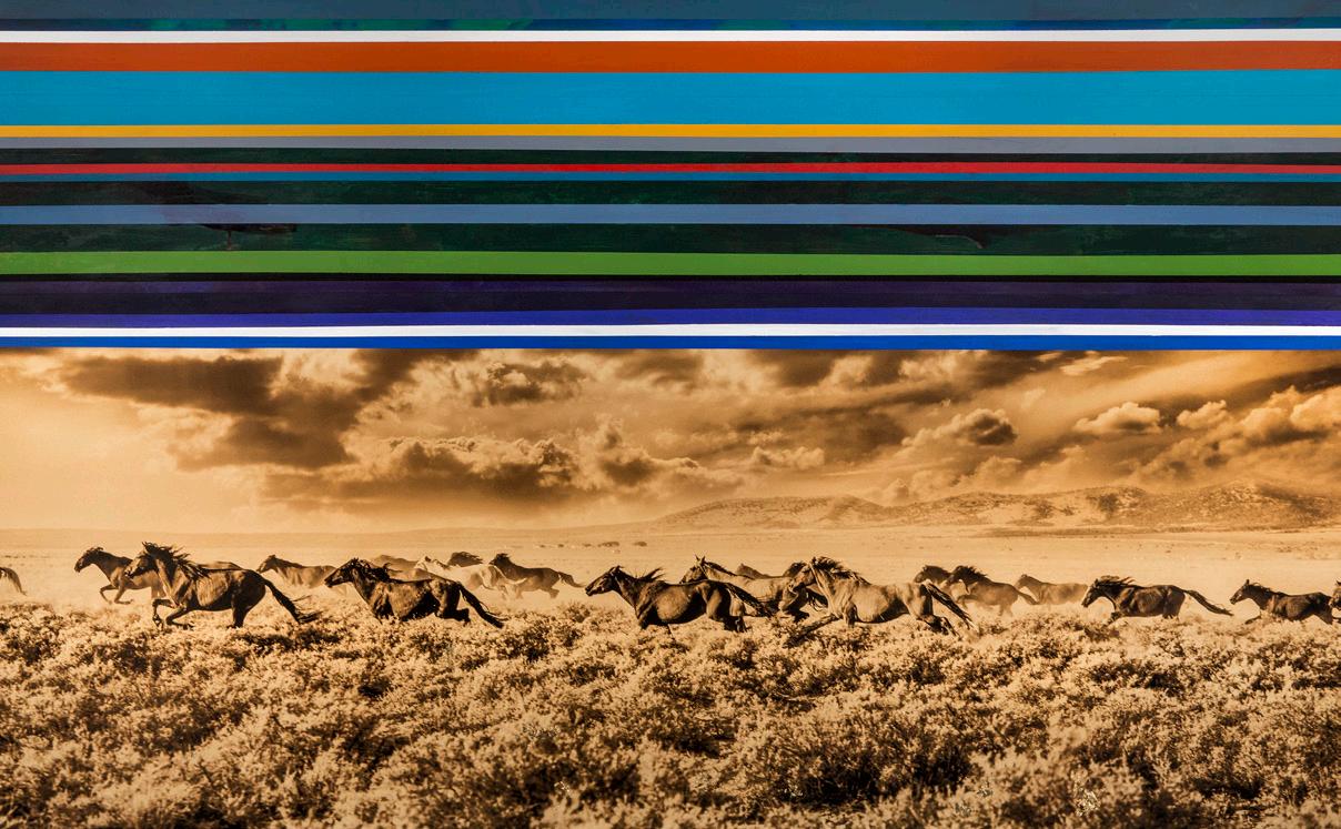 In downtown Bend, the walls of Hot Box Betty boutique are alive with energy and color. Black-and-white images of horses mid-stride, waves crashing and night skies lit by constellations become surreal with layers of oil paint, pennies embedded in resin and flecks of gold leaf that catch the light. These are works from “Golden,” a decade-long collaborative project between siblings Brown W. Cannon III and K.C. Cannon, whose distinct mediums of photography and painting converge on each of the collection’s canvases.