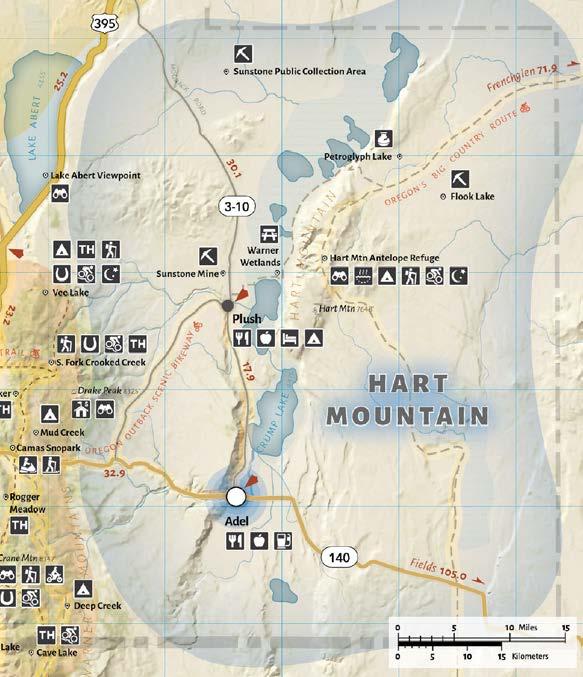 Dip into high-elevation hot springs tucked against the eastern side of Warner Peak and gaze upon vistas that stretch to the horizon. In the Warner Lakes Basin, witness the spectacle of thousands of shorebirds, their calls echoing across the sparkling waters. Unearth hidden treasures in the surrounding sagebrush plains, such as sunstones, jasper, agates and opals. Oregon’s official state gem, the crystalline sunstone, shimmers with coppery sun-like sparks and can be found at the Oregon Sunstone Public Collection Area or Spectrum Sunstone Mine. Follow in the footsteps of 19th-century explorers along the historic Oregon Central Military Wagon Road, feeling the pulse of pioneer spirit that still beats in this untamed land. Let the Warner Wetlands captivate you with its shifting beauty and glide along the 10-mile Warner Valley Canoe Trail, surrounded by a tapestry of shallow lakes and lush marshlands teeming with wildlife. At the heart of it all stands the Hart Mountain National Antelope Refuge with its star-studded skies. Venture out by jeep or mountain bike to spot more than 300 species of wildlife.