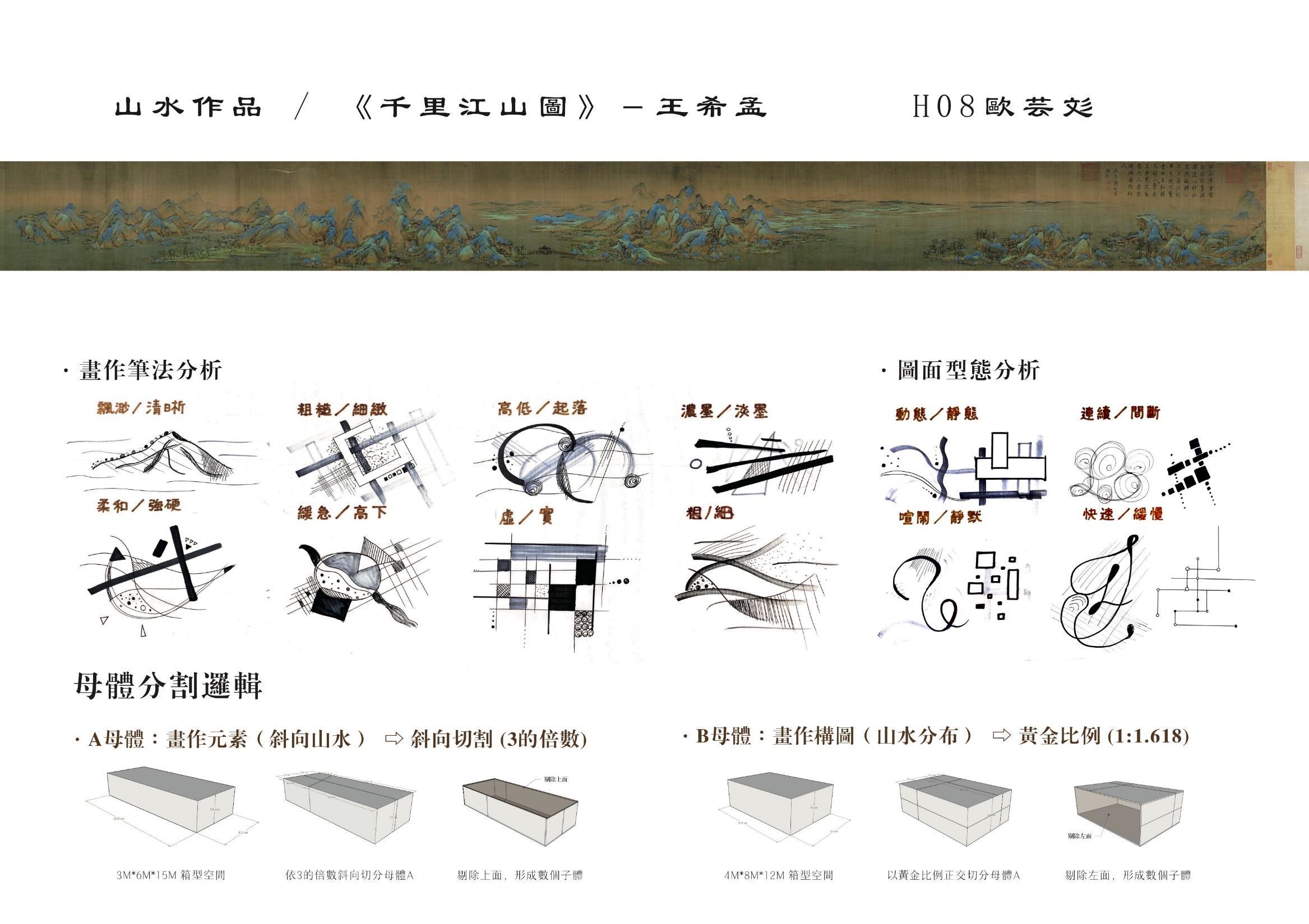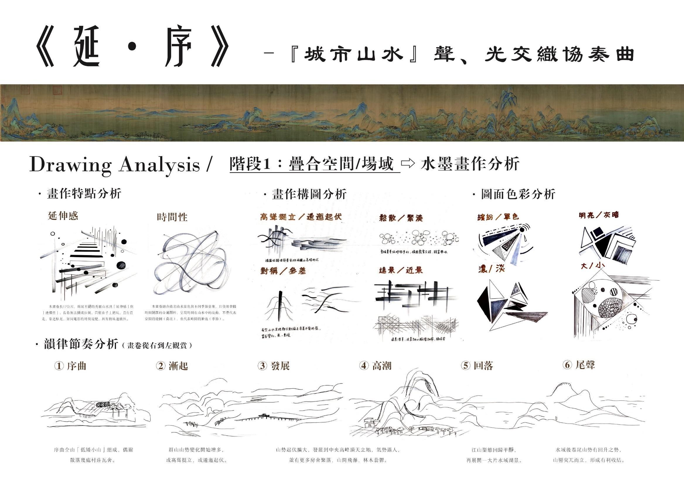 本設計題目 《 延序 》 是我對城市山水的想像,延是延伸,序是 序曲,無論量體與視野都具延伸感, 並 且如樂曲一般具韻律節奏、 起承轉合之空間。 此設計從我挑選的水墨畫作 《 千里江山圖 》 出發,這幅長畫卷 從右到左觀賞會如同一首樂曲,分為六個不同的韻律節奏。分 別 是 「序曲」、「漸起」、「發展」、「高潮」、「回落」、「尾聲」。 本設計概念主要分析此長軸畫卷從左至右的「韻律節奏」,將 其轉譯為「空間序列」 ,嘗試營造和山水畫一樣之起承轉合與空間 氛圍。 並 嵌入空間劇本,加入基地與機能思考。隨著畫作韻律節奏, 一同如同聆聽空間樂曲,徜徉於此「城市山水」之間。 08