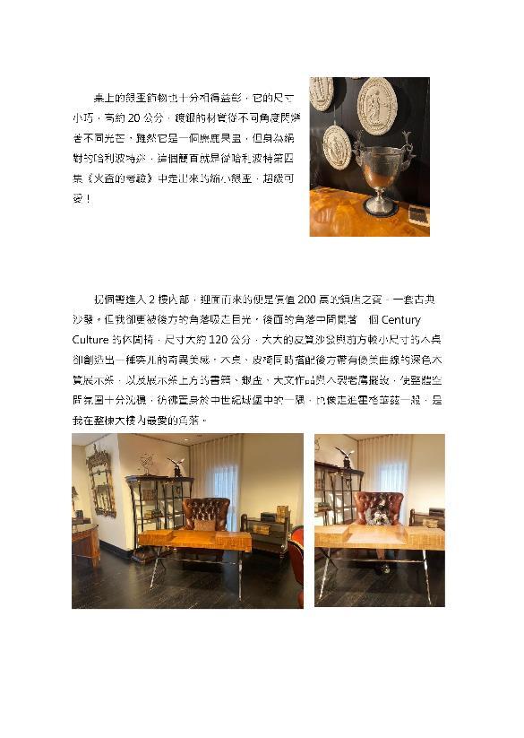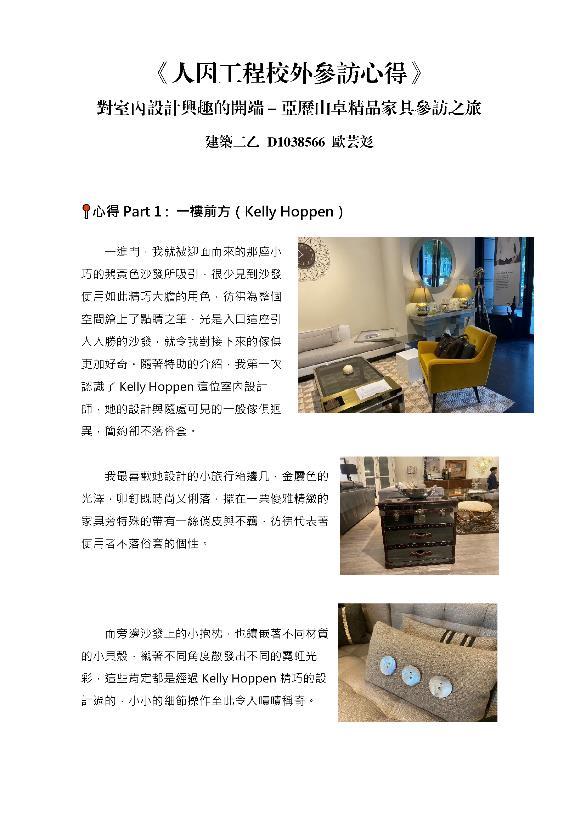 這項活動老師帶我們到「亞歷山卓精品家具」 參訪,讓我體會到家具設計的精妙之處,無論是 人體尺度、材質變化、設計巧思都令人嘆為觀止, 也讓我提起鑽研室内設計的興趣,是收穫滿滿的 一次參訪之旅,謝謝文亮老師的帶領,不然我可 能一輩子都不會發現原來家具與室内設計這 麼 有 趣,我非常非常喜歡! 03 《 精品家具參訪 》 | 人因工程作業 |