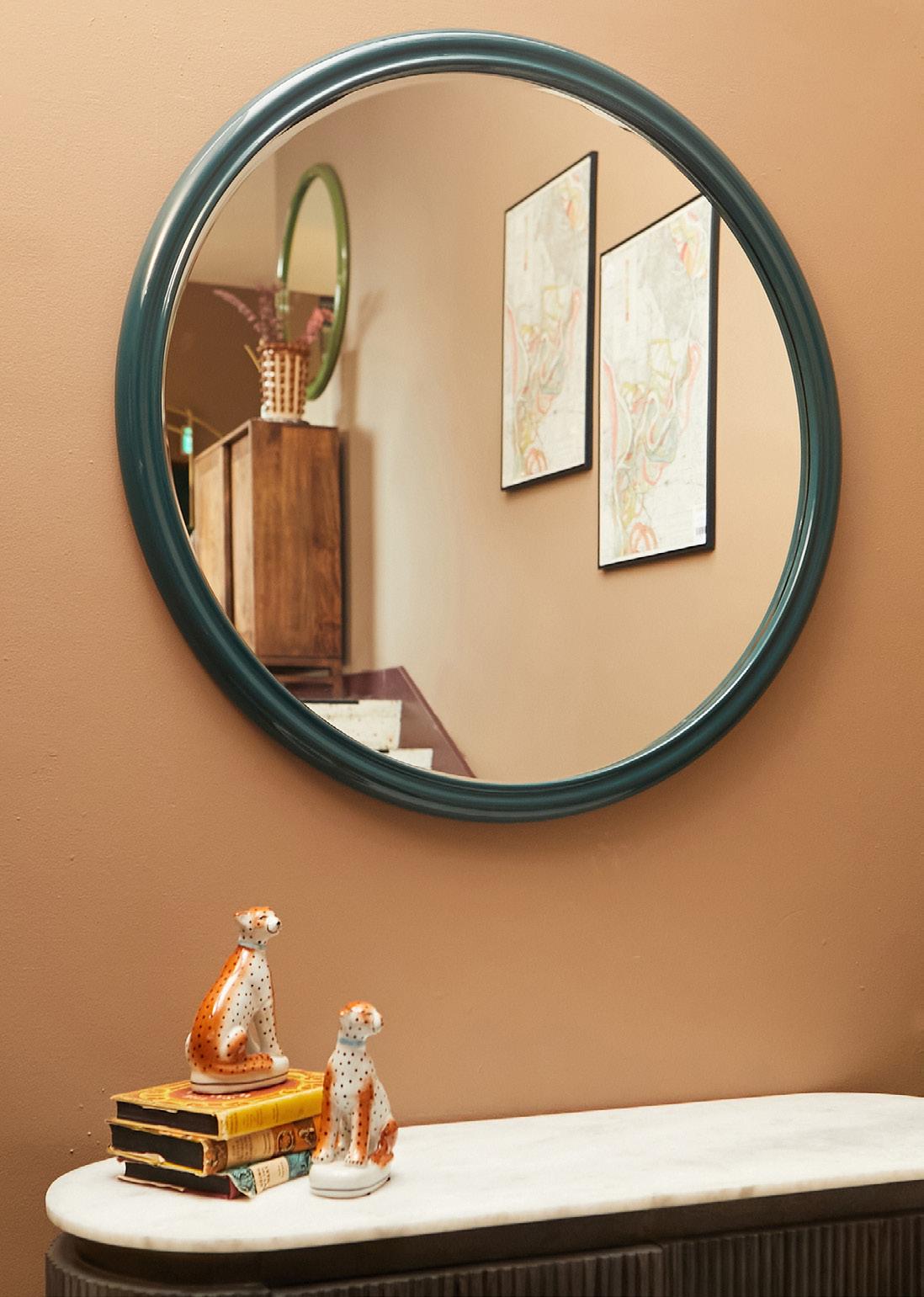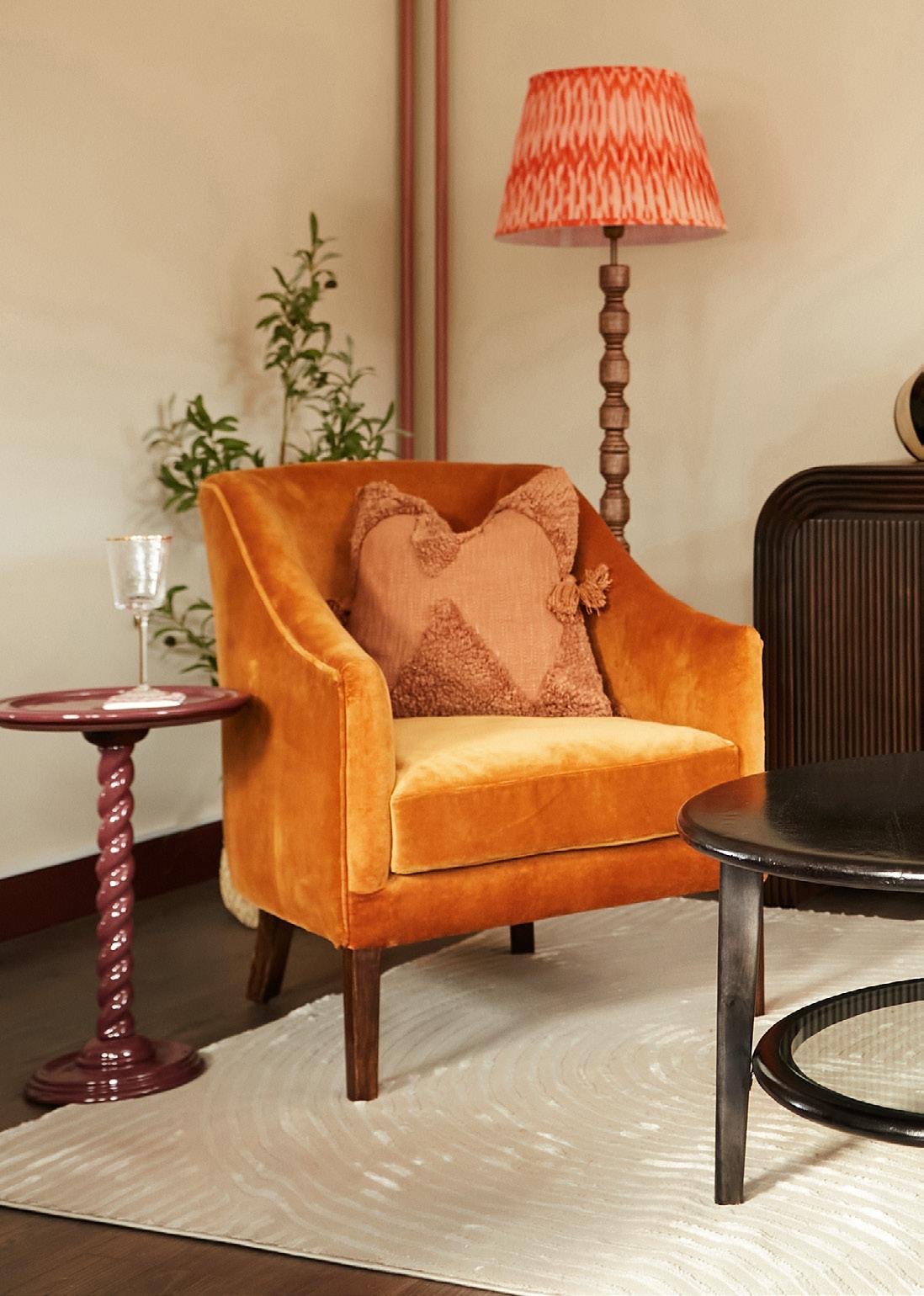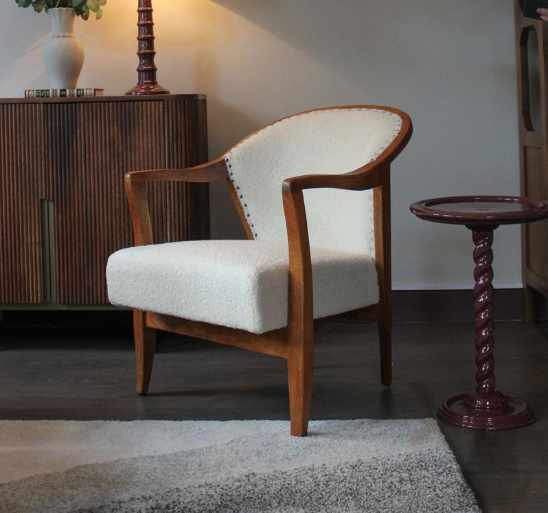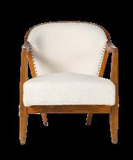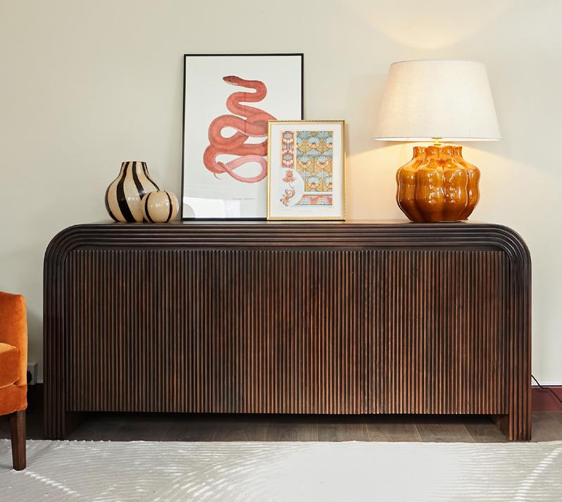 Upholstered pieces like mid-centuryinspired velvet armchairs in burnt orange and olive, and cosy boucle fireside armchairs are also key pieces, alongside enamel finished and bobbin framed mirrors and decorative lighting designs. The combination of textured and smooth finishes throughout the collection whether it’s stone and wood or pleats and enamels is a recurring feature of the Oriana B style.