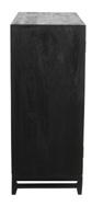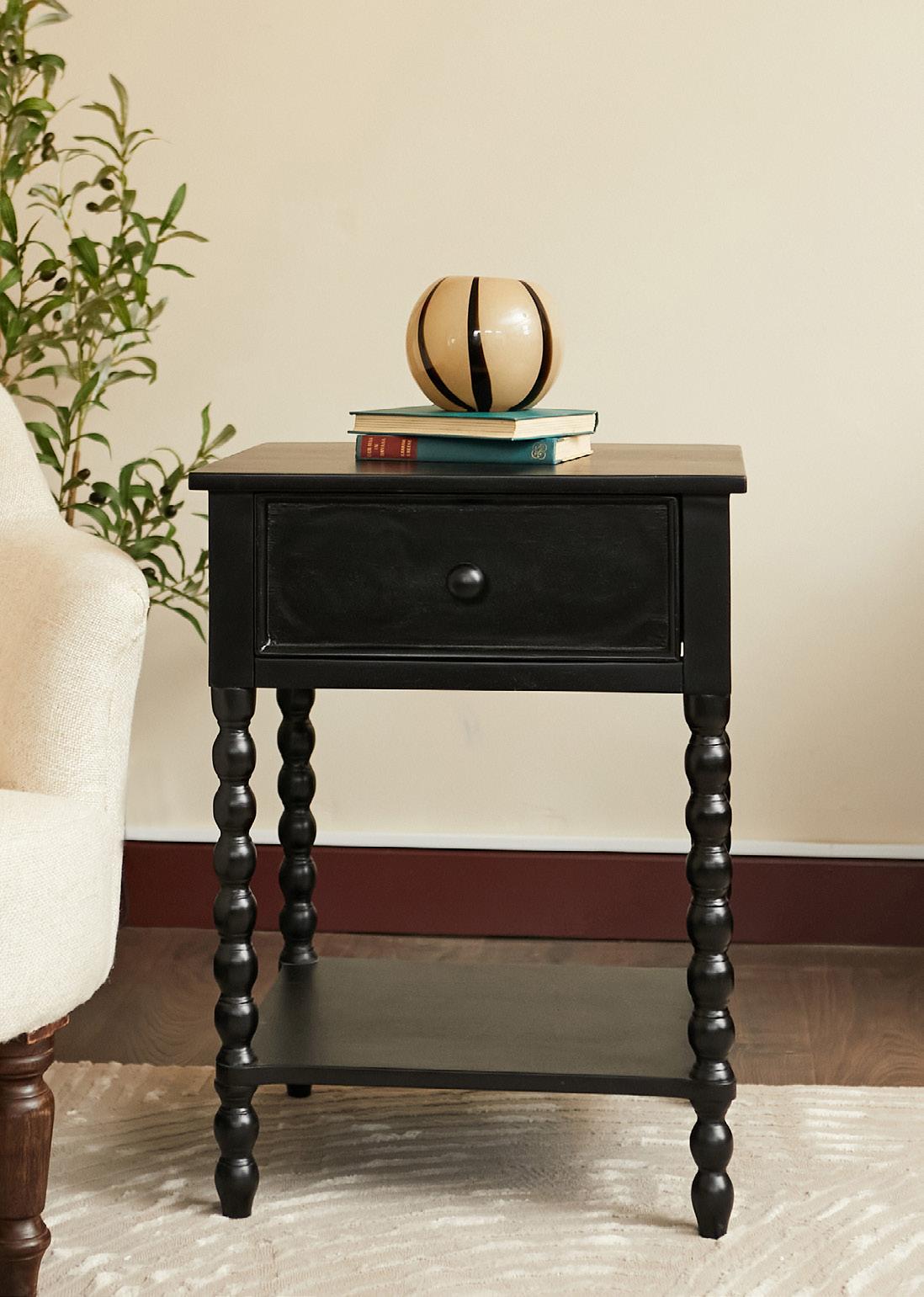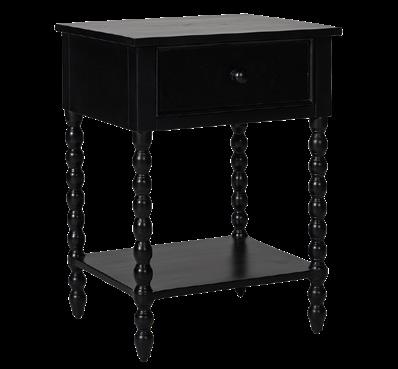 Generous side table in matt black finish with capacious drawer, lower shelf and bobbin style legs. Ideal for end of sofa or bedside.