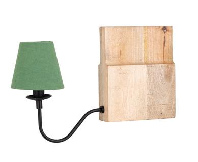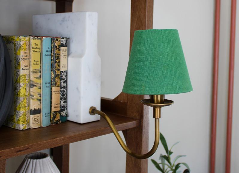 The wooden bookshelf lamp has a wood base that sits on the bookshelf, a black light fitting and a neat green shade.