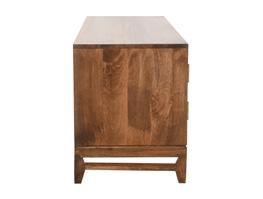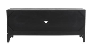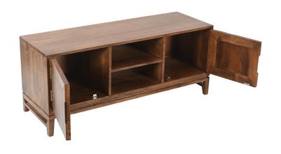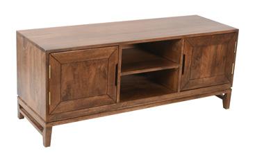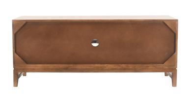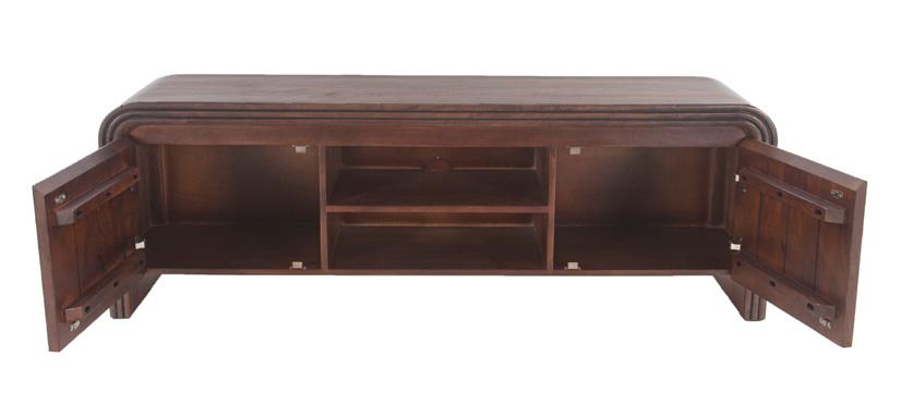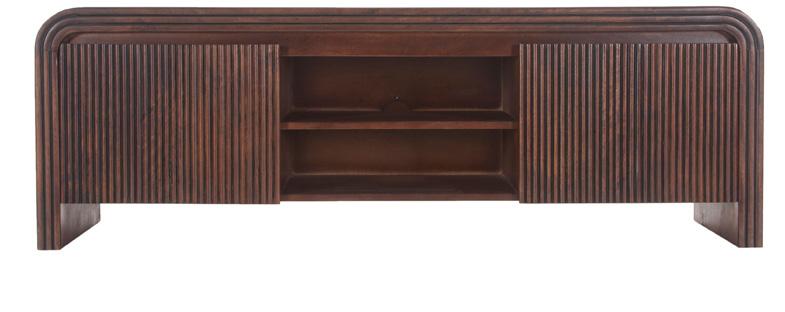 Dark wood TV cabinet with curved continuous waterfall design and fluted edges. Two doors flank central shelved area with circular cut out for cables which is also supplied with cover when not in use.