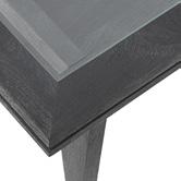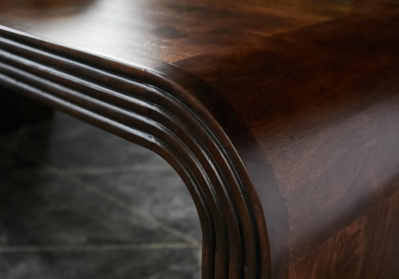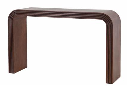 Dark wood console table with curved continuous waterfall design and fluted edges for a restrained and luxurious aesthetic.
