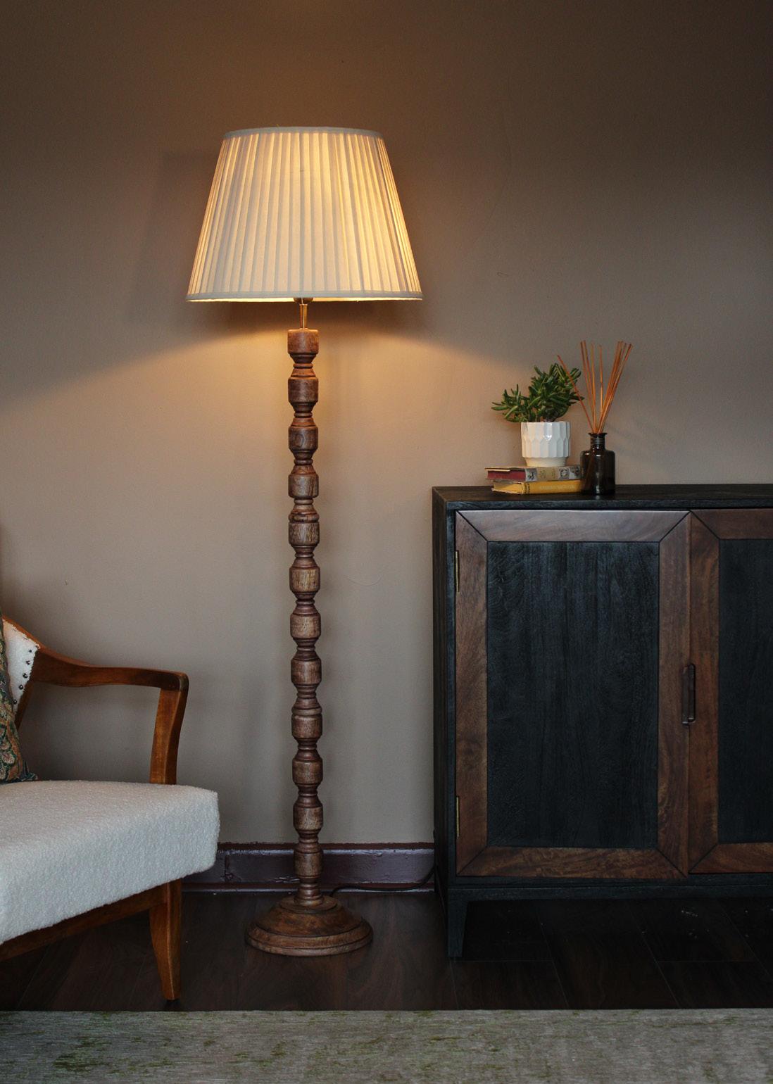 Turned wooden floor lamp with attractive hand carved design. Works with the Large Pleated Empire Shade and available in all five colourways.