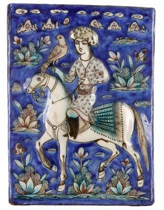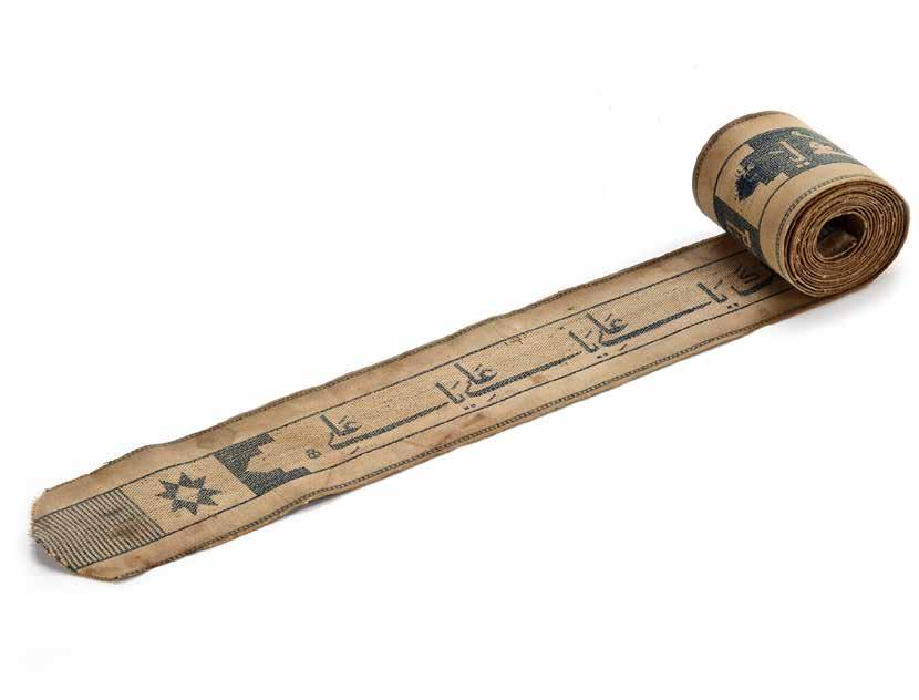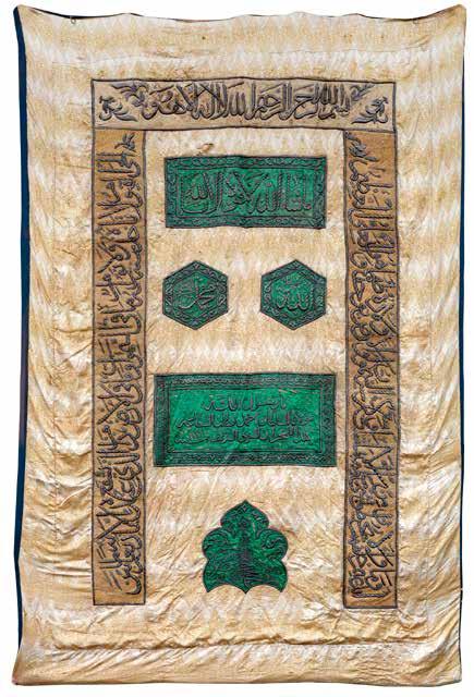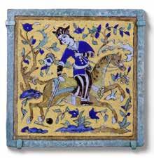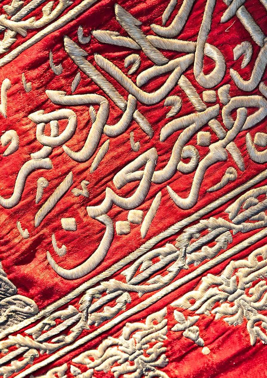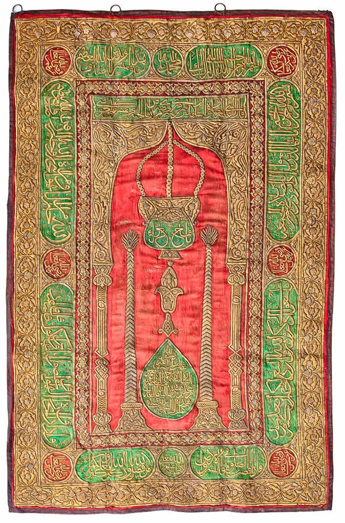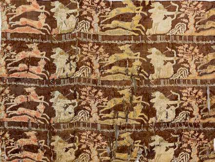Of rectangular form, embroidered on a brown silk ground with four repetitieve bands of a figure with a bow throwing an arrow at deer in a hunting scene, below with Arabic inscriptions in kufic script. 48 by 62 cm