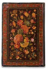 In deep brown morocco leather binding with flap decorated with gold painted central medallion and border. 11 by 15 cm.