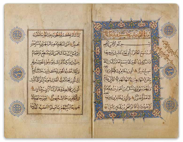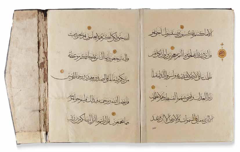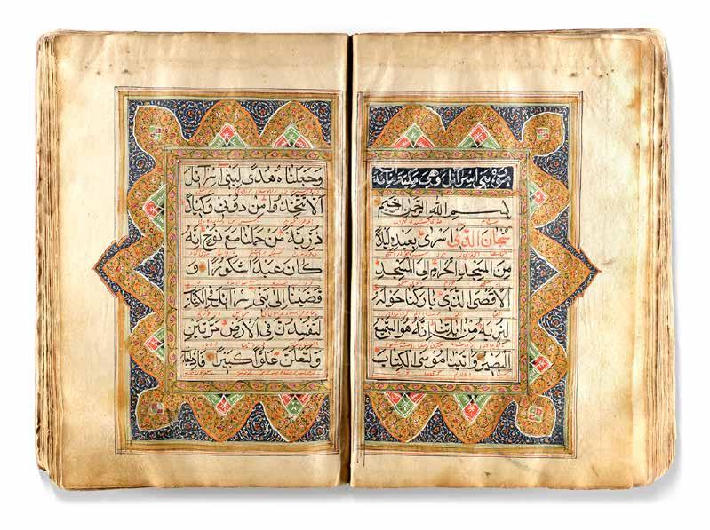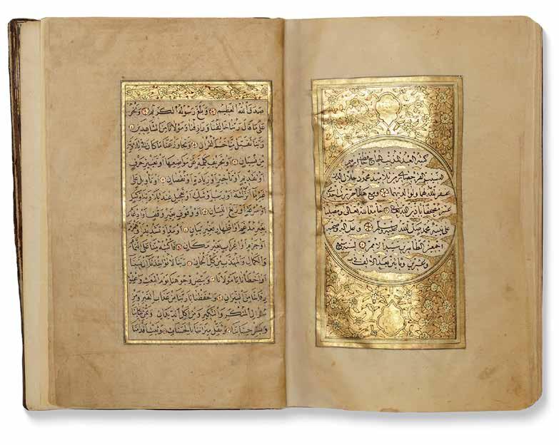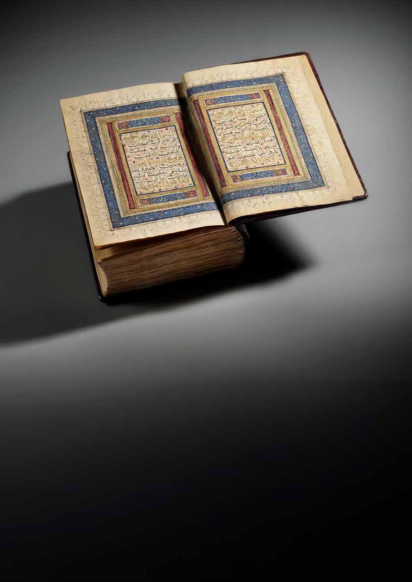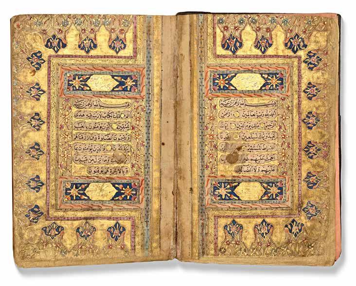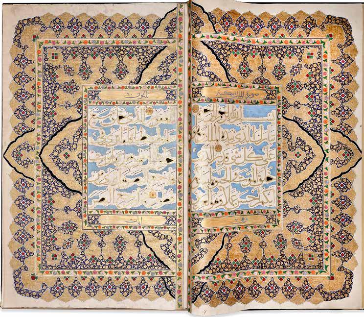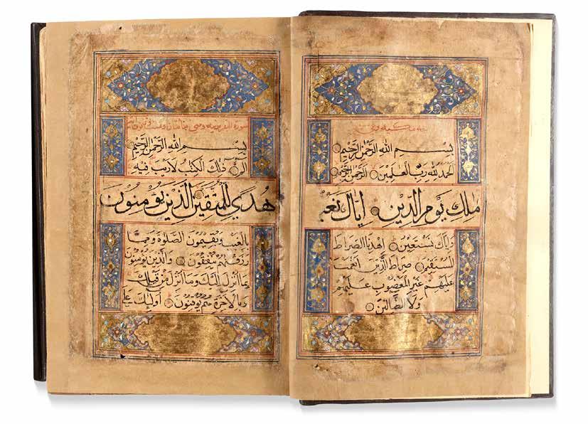 A complete Quran, Arabic manuscript on cream paper, each page with 15 lines, written in black naskh script within gold and polychrome rules, gold roundel verse markers with polychrome dots. Surah headings in white thuluth script with gold and polychrome decoration, gold and polychrome marginal motifs indicating the ‘Juz’. Two opening biofolia heavily gilt with gold and polychrome decoration framing 7 lines of black naskh in clouds reserved against a sprinkled gold ground.