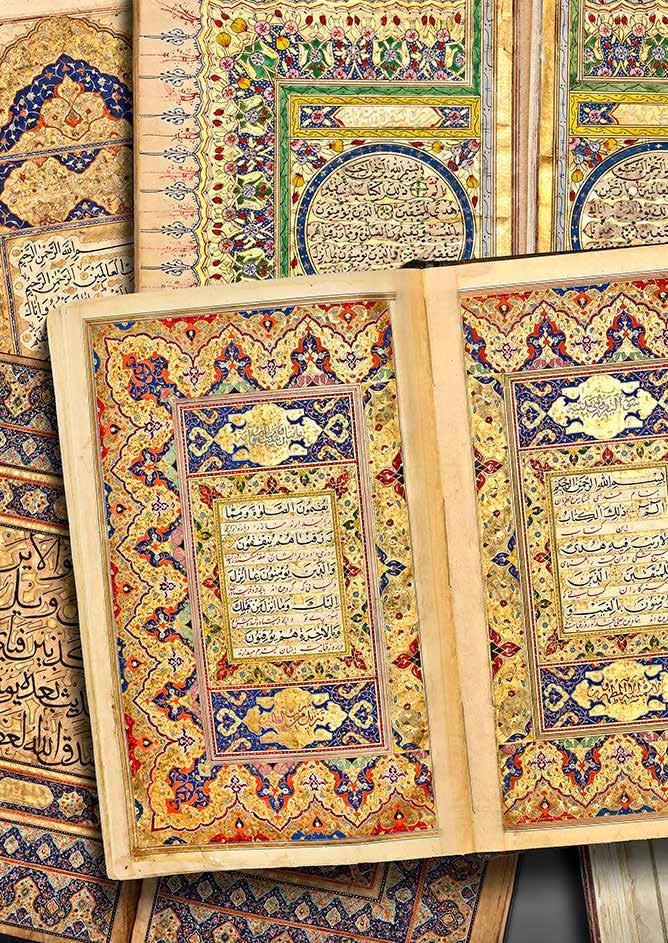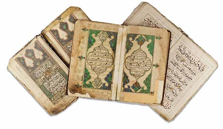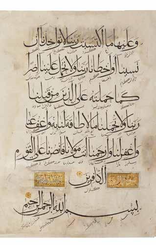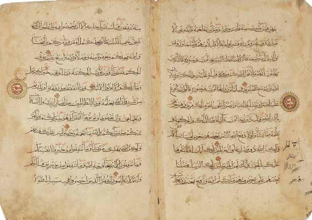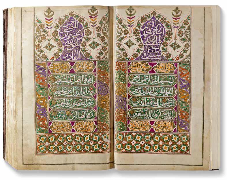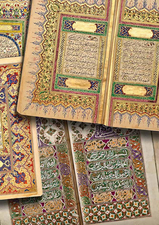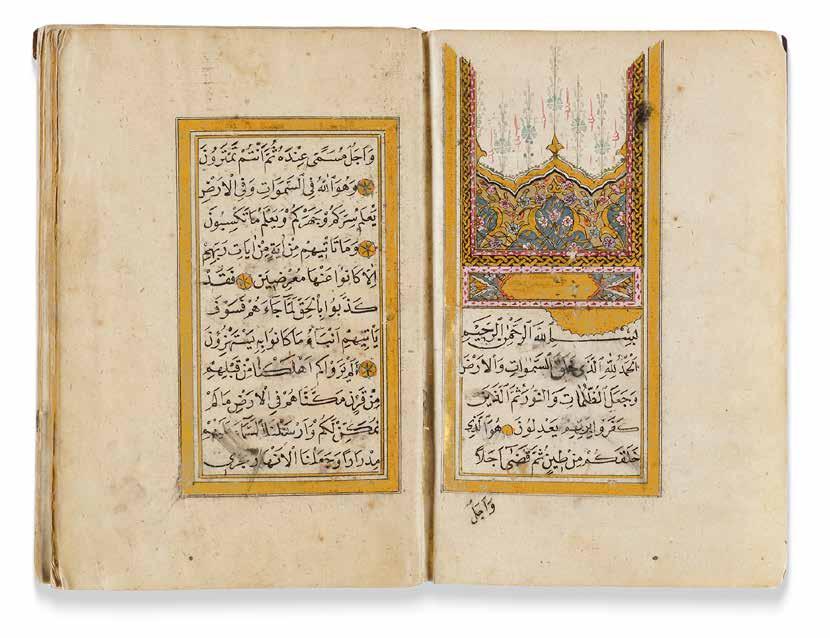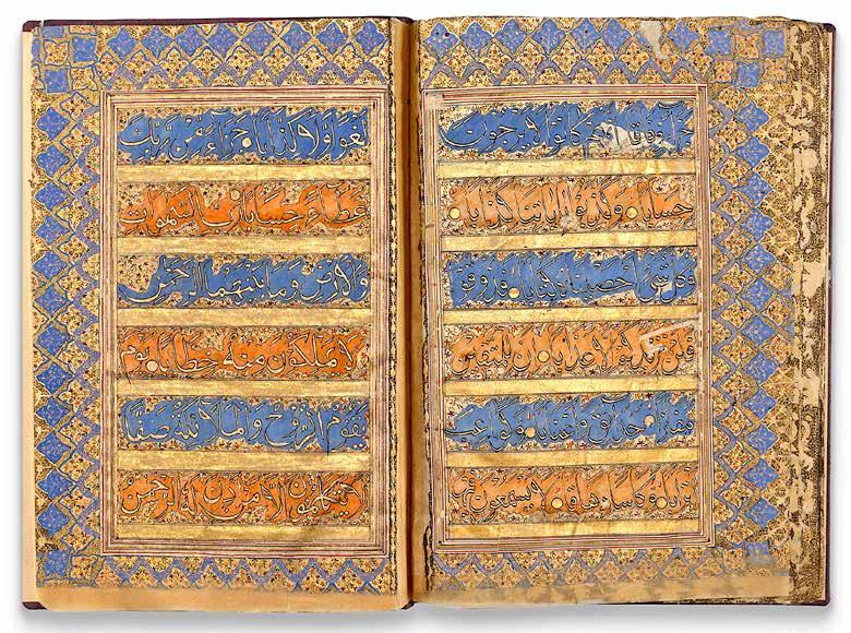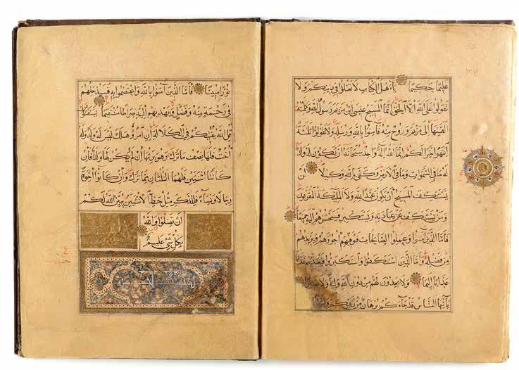 A complete Quran, Arabic manuscript on cream paper, each page with 15 lines, written in black naskh script within gold and polychrome rules, gold roundel verse markers with polychrome dots. Surah headings in white thuluth script with gold and polychrome decoration, gold and polychrome marginal motifs indicating the ‘Juz’. Two opening biofolia heavily gilt with gold and polychrome decoration framing 7 lines of black naskh in clouds reserved against a sprinkled gold ground.