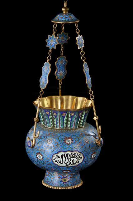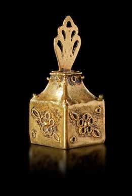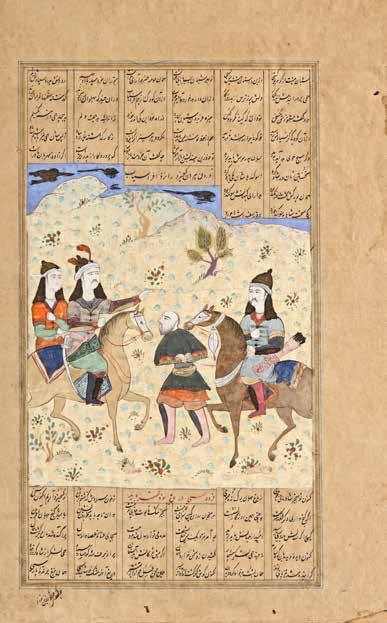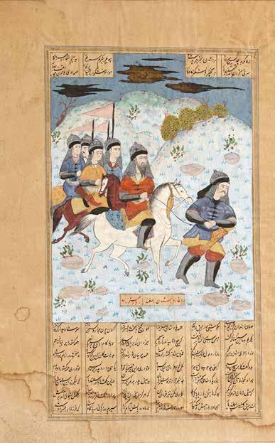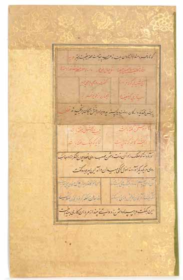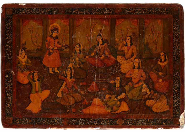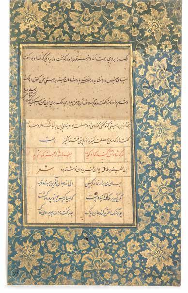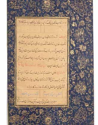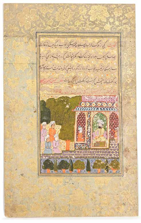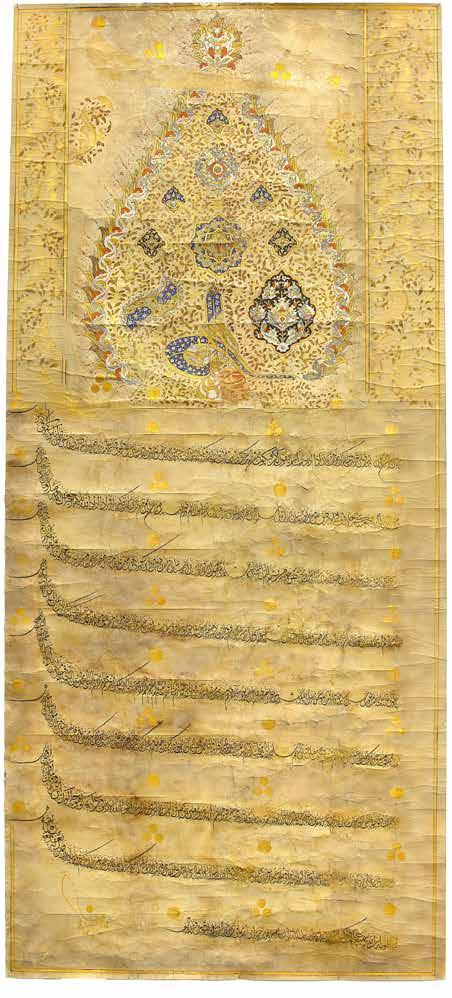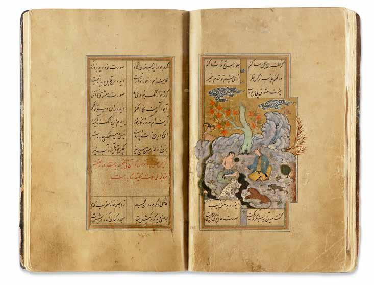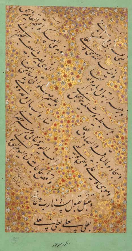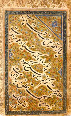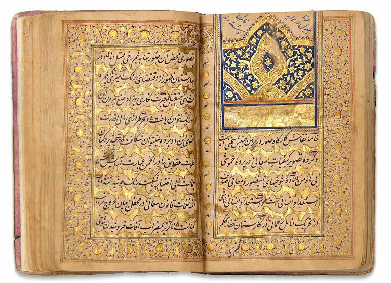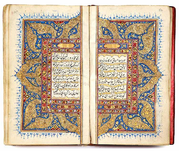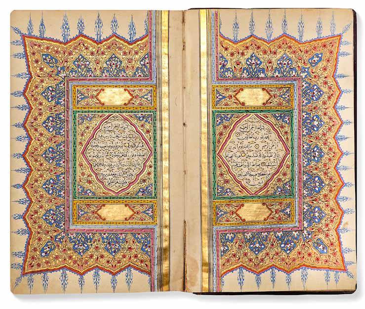 Arabic manuscript on silk paper, 34ff. each page with 6ll. written in elegant gold thuluth script outlined in black, resrved in blue and orange clouds against a gilt floral decorated ground , underlined with a broad gild border, large gilt verse roundel markers outlined in black ruled in gilt and polychrome borders, the margins of each page excessively decorated with gilt floral lotus and peony scrolls on a gilt ground. Surah headings of Basmallah in gilt naskh script outlined in black on a gilt floral decorated ground. opening folio with gold and polychrome illuminated headpiece. in original Safavid brown morocco with flap with large panel of stamped and tooled gilded decoration, doublures with elegant gilded decoupé arabesque medallion and spandrels over coloured panels.