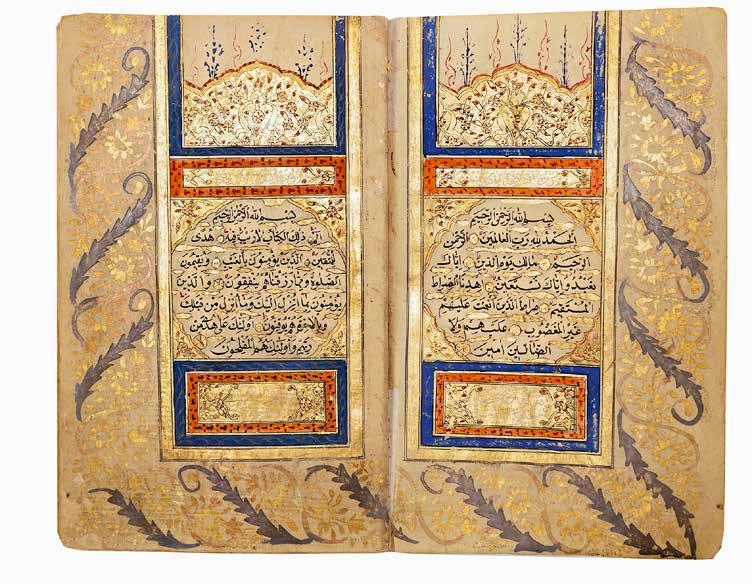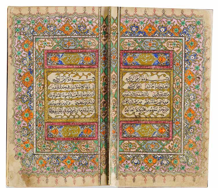 Arabic manuscript on paper, each folio with 15 lines of elegant black naskh script, diacritics and vowels in red, marginal occasional notes indicating ‘Juz’ and Hizb’, text within double gold and polychrome rules, surah headings in thuluth red script on a gold and blue decorated cartouche, two opening bifolia fully illuminated in gold and polychrome decoration framing 7 lines of elegant naskh script in clouds reserved against a sprinkled ground. f.2b and f.3a framing lines in clouds reserved against a gold ground with a floral scroll stylized margins. Two pages at the end heavily illuminated with polychrome decoration. The last three pages with a prayer for completion of the recitation of the Quran (Due- al-Khatm).
