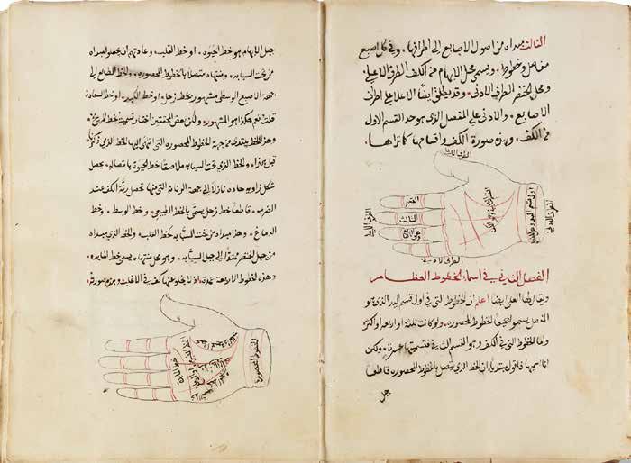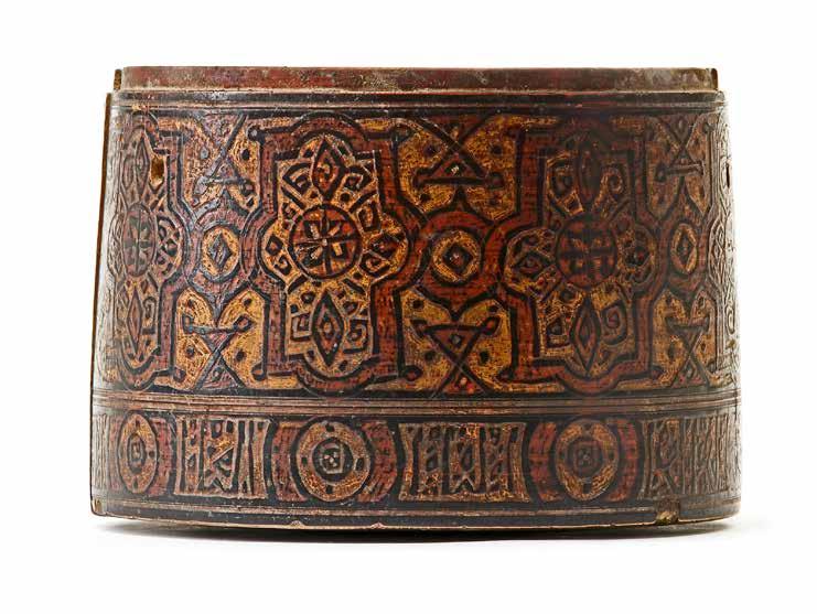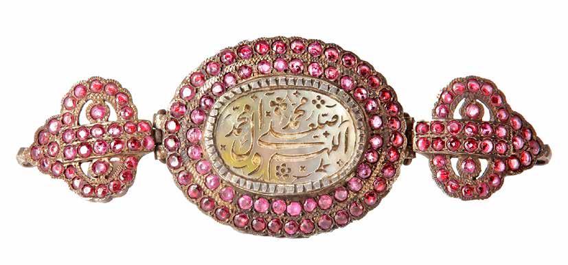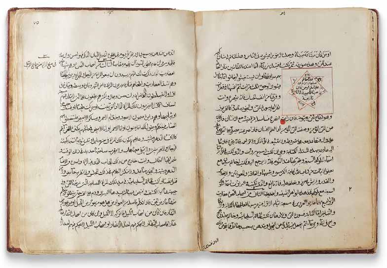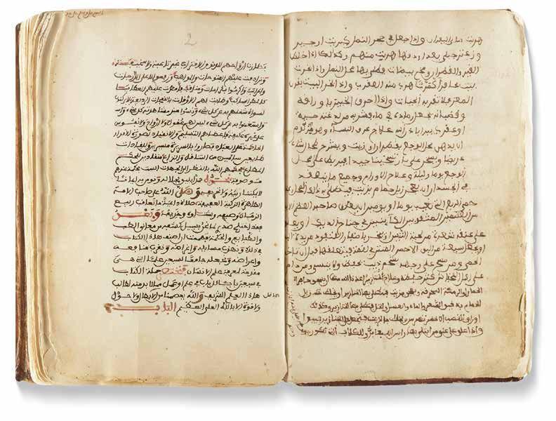 Al-Jazuli’s renowned work in praise of the Prophet Muhammad, Arabic manuscript on paper, each folio with 10 lines written in bold sepia Maghribi, titles in bold gold and polychrome Maghribi within illuminated cartouches, important words such as Allah and Muhammad in blue or red, text within blue and red rules, catchwords, two contemporaneous illustrations of the minbar of the Prophet and the tombs of the first Caliphs, copious added notes, in red morocco binding with gilt highlights. 12 by 12 cm.