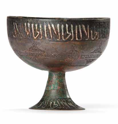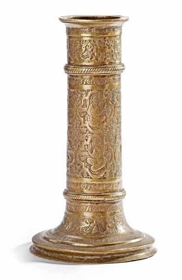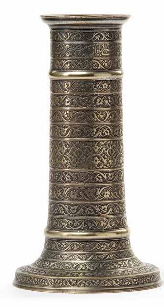 Of cylindrical form with flaring mouth, kick to base, decorated in polychrome enamel and gilt with a band of inscriptions in thuluth script on a blue ground.