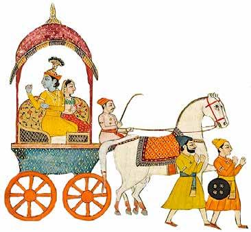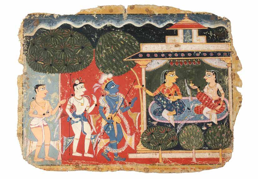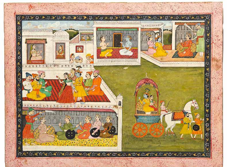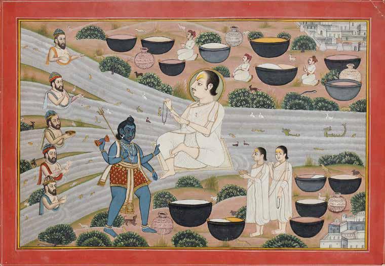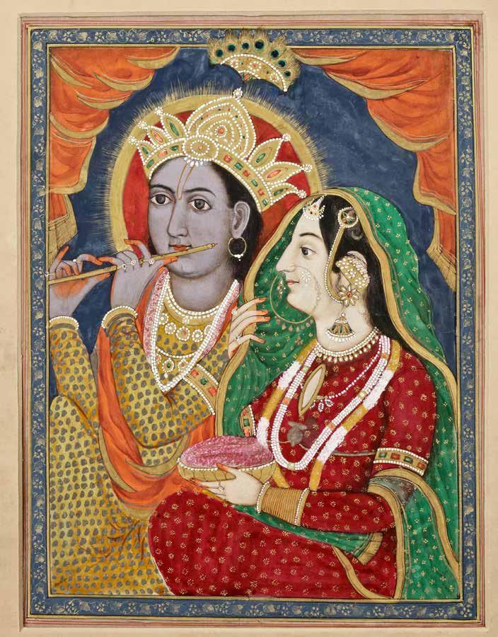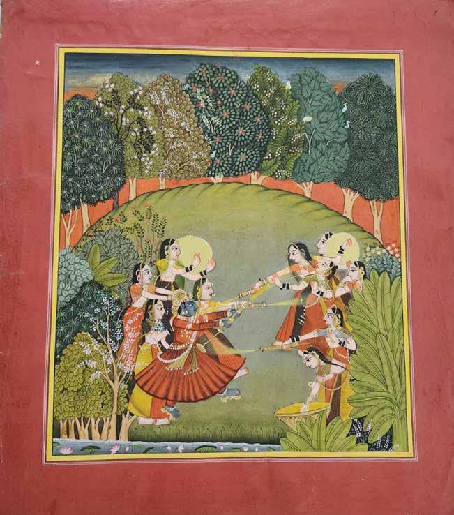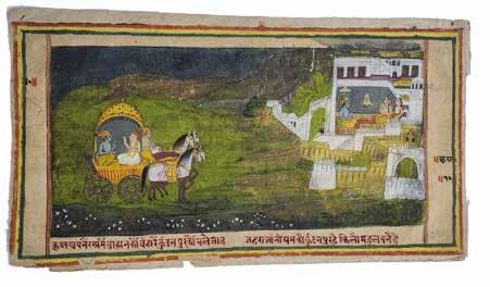 This work exemplifies the devotional fervor and visual richness of Rajasthani miniature painting, where the divine and the earthly meet in moments of spiritual surrender and grace.