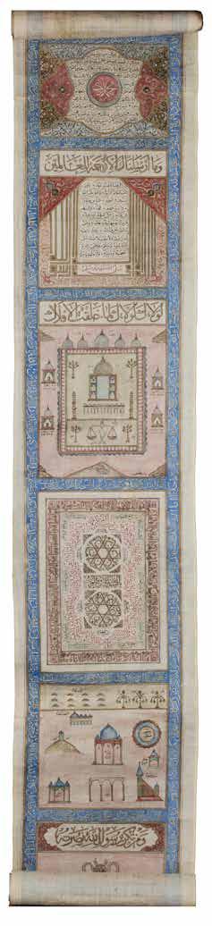 Further two detailed illustrations Mecca and Medina with Al-Masjid AL-Haram and Al-Masjid AL-Nabawi, different attributed names to the Prophet, 6 chapters or ‘’Hiz’’ of prayers, occasional marginal notes, colophon signed ‘written by al-Faqir Ubeydullah zehni, the first Imam of Mihrimah Sultan Mosaque in Edirne, student of Abu Bakr Rasid and dated in Rmadan 1217AH ‘