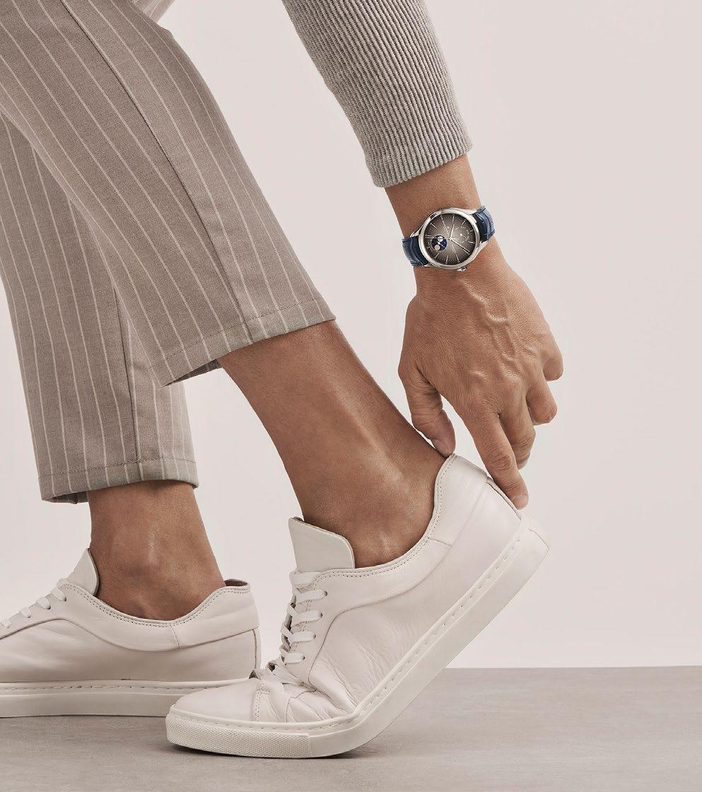 Tích hợp chuyên môn thiết kế và tài nghệ sản xuất của Baume & Mercier, điểm nổi bật của tạo tác không chỉ là những chức năng theo nhu cầu mà còn ở chi tiết thiết kế theo đuổi sự cân bằng về tỷ lệ và hài hòa về chất liệu và màu sắc. Trên mặt số sơn màu xám, ở vị trí 6 giờ là lịch tuần trăng có tạo hình của bầu trời đầy sao được phóng đại qua kính sapphire xám khói. Xung quanh là các chỉ số giờ hình đinh tán và kim hình chữ alpha mạ rhodium thanh lịch. Cả hai mặt đều được bảo vệ bởi lớp kính sapphire hình vòm phủ chống lóa mang lại khả năng đọc tuyệt vời dành cho các quý ông.