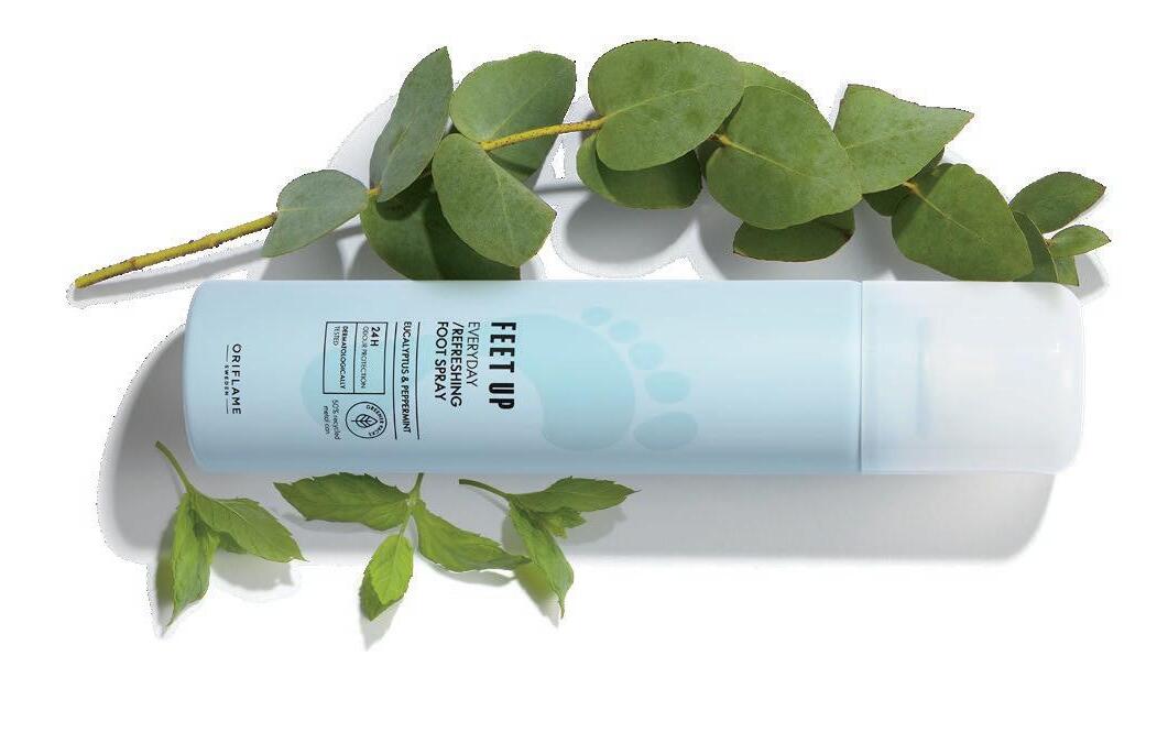 Revive los pies cansados con el spray refrescante, enriquecido con aceites de eucalipto y menta.