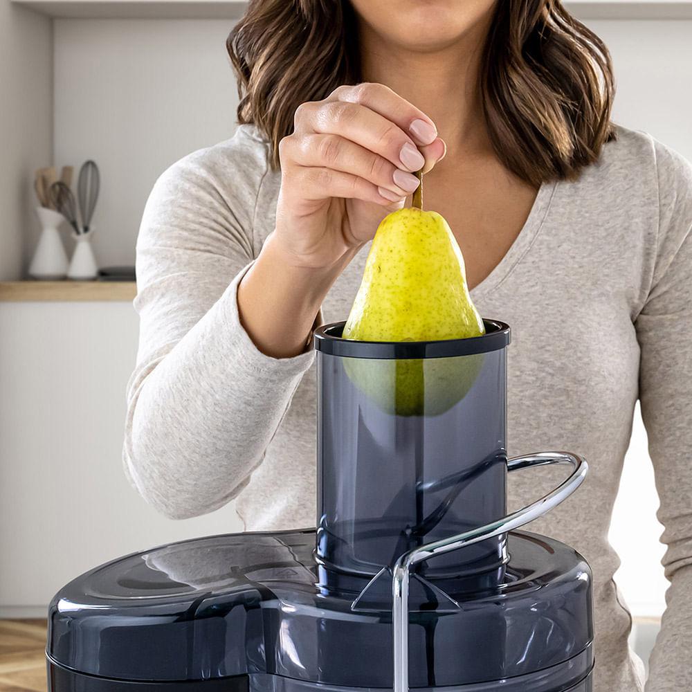 Boquilla fácil de verter / Jarra AS sin BPA de 41 oz / Incluye dos conos: pequeño y grande para diferentes tamaños de cítricos / Giro en dos direcciones / Control de pulpa ajustable / Cubierta de la tapa protectora / Piezas desmontables para facilitar limpieza / Diseño compacto