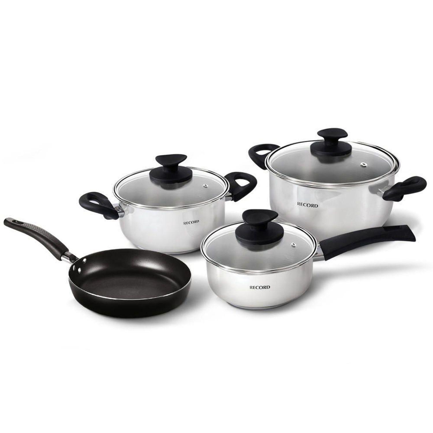 7 Piezas / Incluye: Olla de 4.0 L - Olla de 2.3 L – Cacerola de 1.5 L – Sartén Antiadherente / Acero inoxidable con acabado interno lijado suave al tacto y externo pulido brillante / Excelente conservador del calor / Mango de bakelita aislante de calor en color negro, diseño ergonómico para un manejo cómodo y seguro / Tapa de vidrio templado con borde protector en acero inoxidable / Orificio para salida de vapor durante la cocción de los alimentos