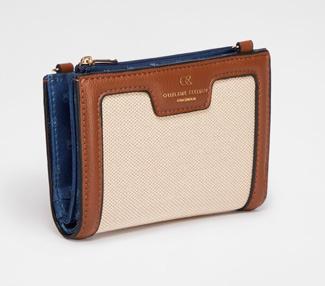 • Color marfil texturizado con bordes en marrón oscuro y herrajes dorados.