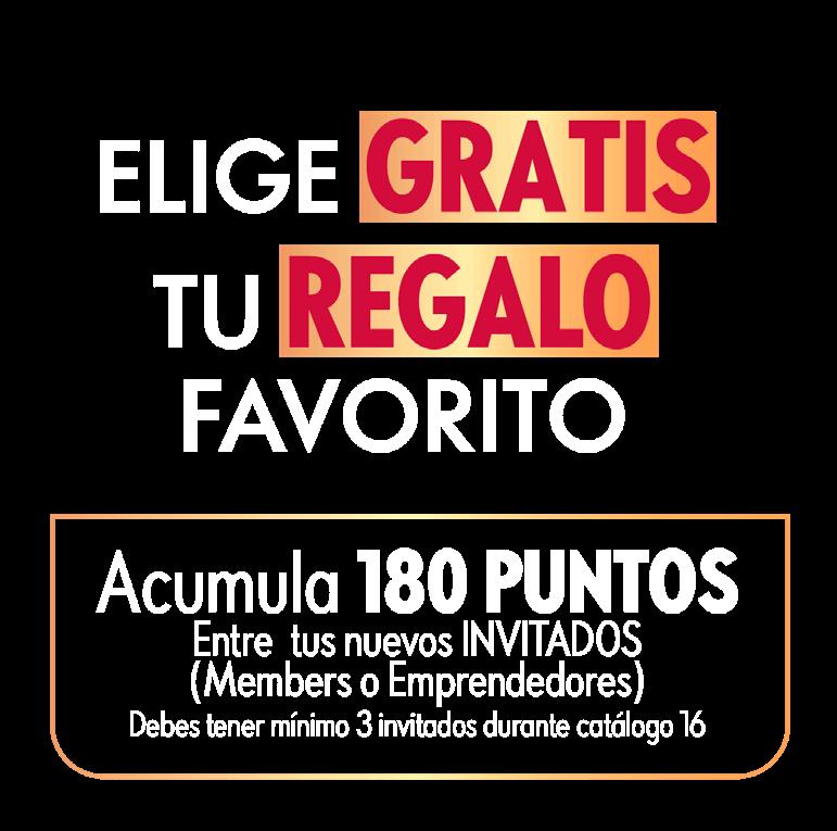 Para ganar cada premio se debe lograr el mínimo de invitados y acumular entre ellos el puntaje exigido para cada nivel./ Todos tus nuevos invitados sean Members o Emprendedores te cuentan para lograr los puntos requeridos para cada nivel./ El Patrocinador deberá acumular 100 puntos o más en su pedido personal en catálogo C16./ Se puede ganar una vez cada premio de acuerdo al nivel alcanzado./ Los emprendedores que alcancen cualquier nivel de premios en C16, podrán elegir su favorito en C17 en el módulo de Ofertas para ti./ Un premio por cada nivel alcanzado./ Para recibir los premios, el Patrocinador debe realizar un pedido con puntos en C17-2024./ En caso de agotarse algún premio, deberá seleccionar otro que tenga inventario./ Las devoluciones de productos tuyas o de tus invitados o cancelaciones del pedido, podrán ocasionar la pérdida del premio. / Un nuevo Emprendedor Asociado puede ganar los premios si cumple las condiciones del programa. / No se aceptan devoluciones o cambios por otros premios. / Los distintos premios son acumulables en el catálogo, es decir, si un Emprendedor Asociado alcanza la meta del nivel 3, llevará los premios de cada nivel (1er. 2do. y 3er. premio).