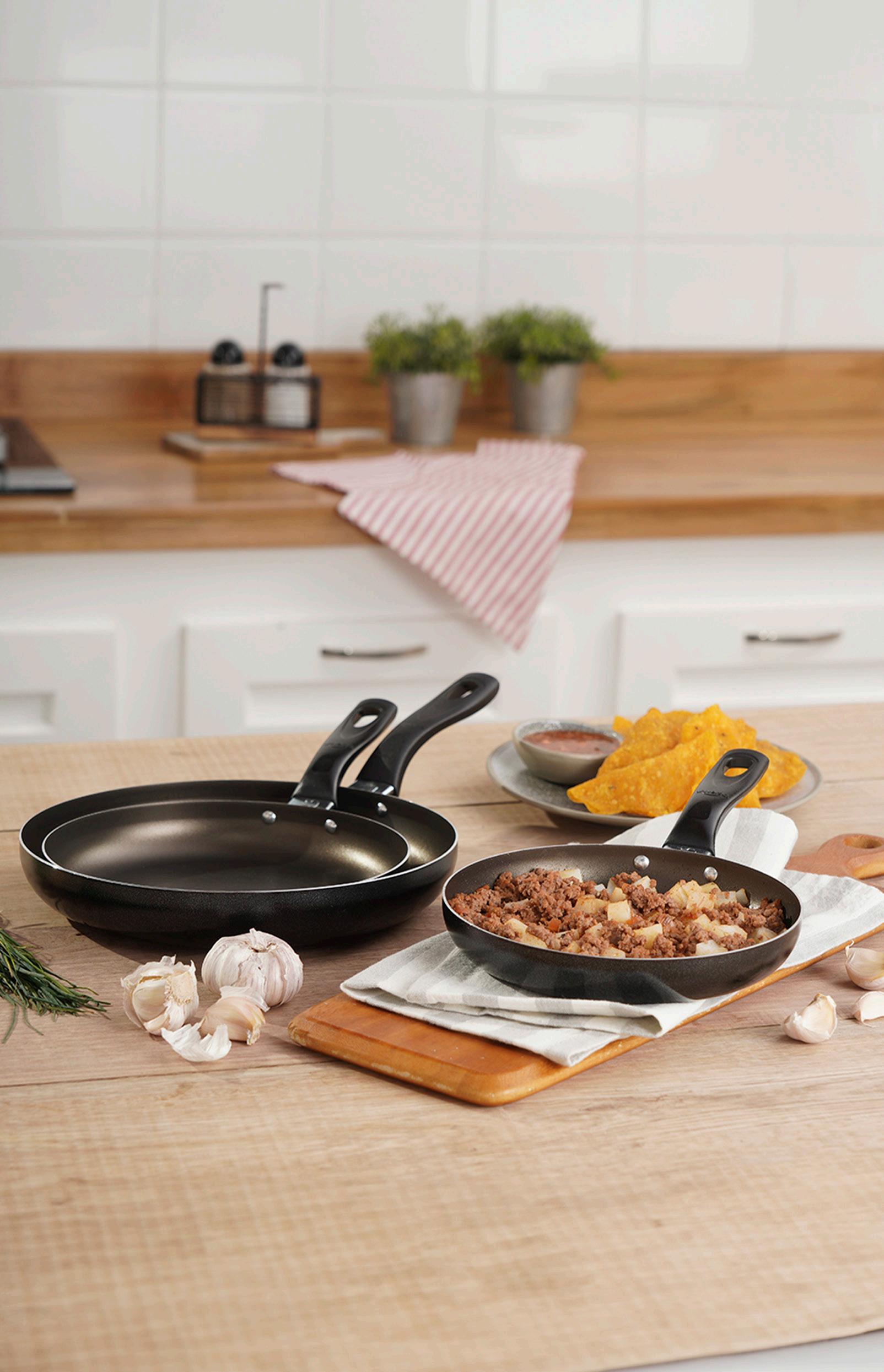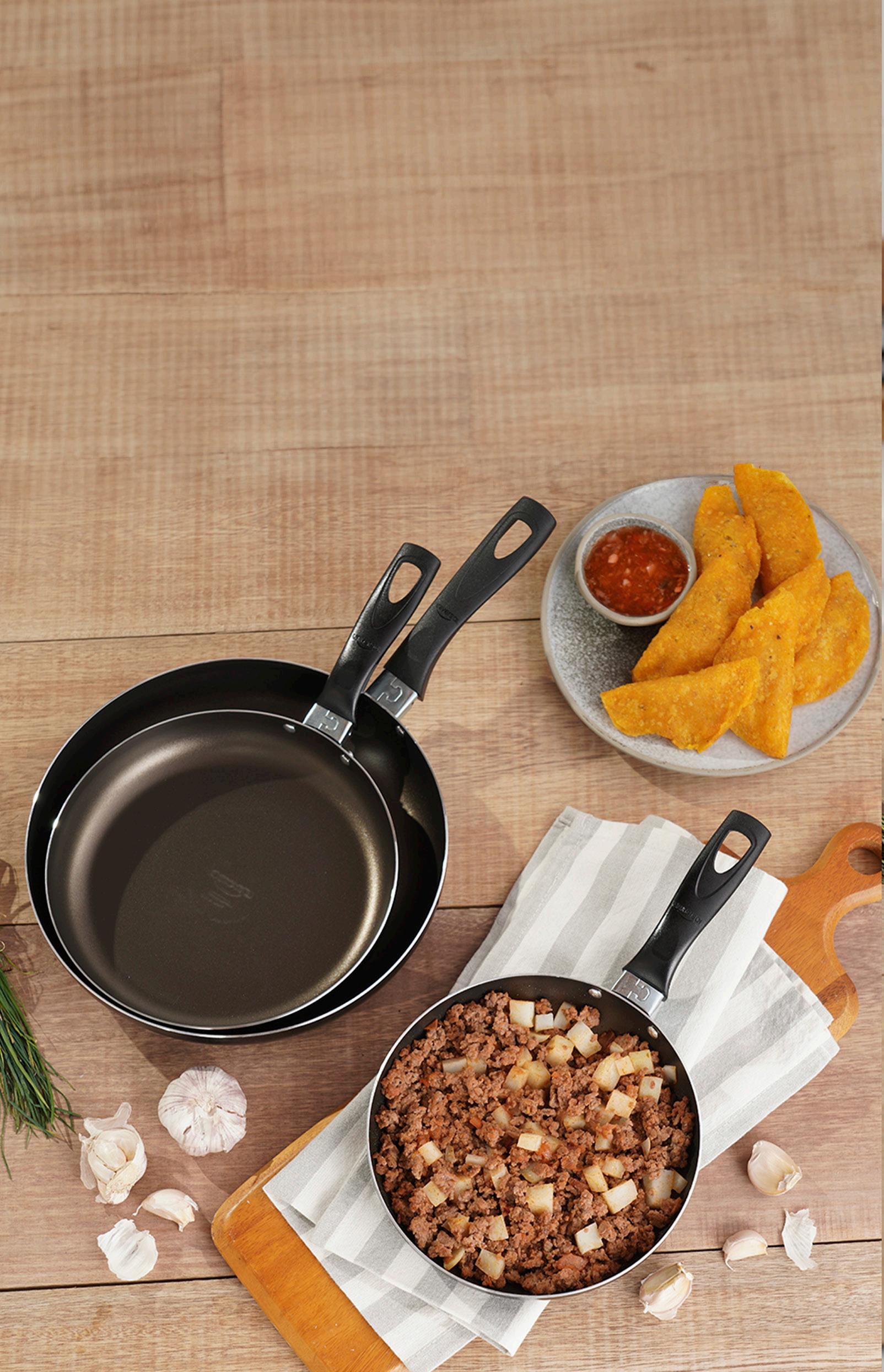 El Set de Sartenes Antiadherentes es ideal para una cocina versátil, permitiéndote freír, saltear y más con facilidad.