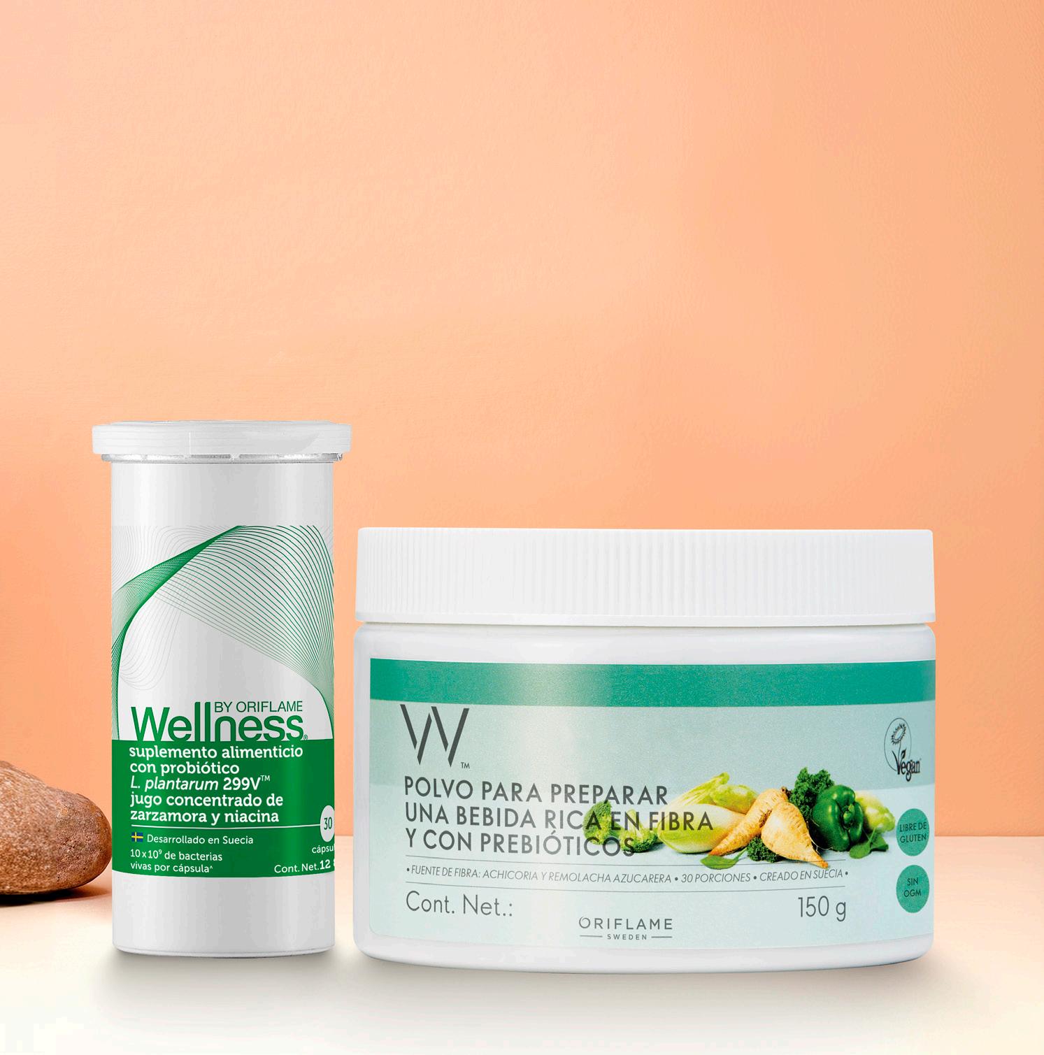 1 Polvo para preparar bebida con fibra prebíotica1 + Suplemento Alimenticio con Probióticos L.plantarum 299V 2